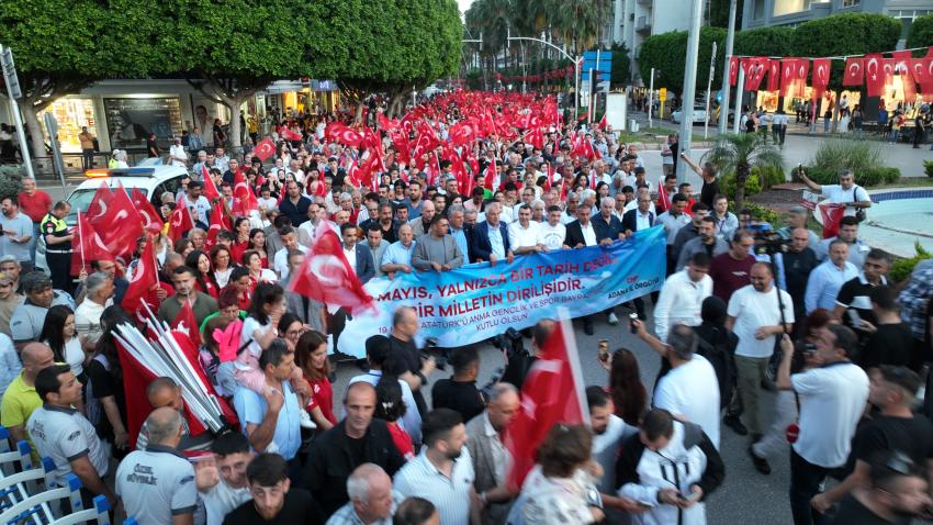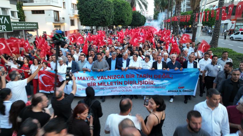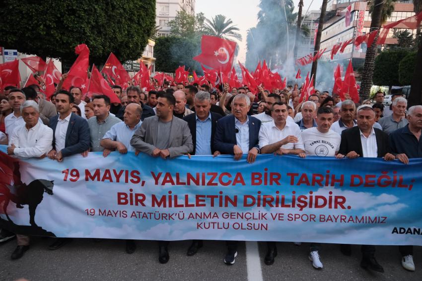 Kortejin önünde, “19 Mayıs Yalnızca Bir Tarih Değildir, Bir Milletin Dirilişidir” yazılı pankart taşındı. Türk Bayrakları ve meşalelerle yürüyen 10 bin Adanalı, zaman zaman Mustafa Kemal Atatürk ve Cumhuriyet temalı sloganlar attı.