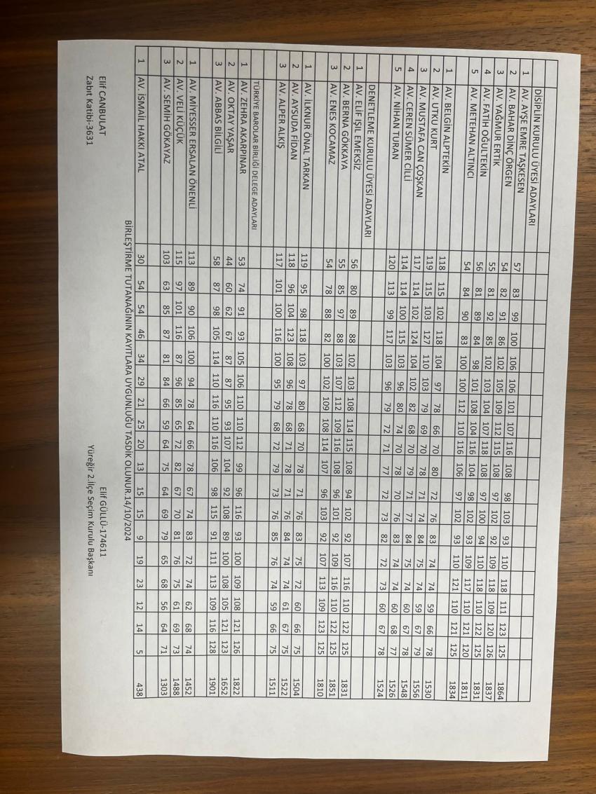 Yönetim Kurulu üyeleri arasında ise en fazla oyu 1957 oy ile Av.Hüseyin Saygılı, Disiplin Kurulu üyeliklerinde ise 1864 oy ile Av.Ayşe Emre Taşkesen aldı. Denetleme Kurulu üyeliklerinde en fazla oyu 1851 oy ile Berna Gökkaya, Türkiye Barolar Birliği Delege adaylarından ise 1901 oy ile Abbas Bilgili aldı. Türkiye Barolar Birliği Genel Sekreteri esi Baro Başkanı Veli Küçük 1488, Eski Baro Başkanı Semih Gökayaz ise 1303 ol alabildi.