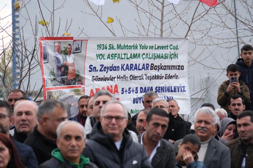 "Her zorluğu aşarak, engelleri atlayarak hizmet etmeye devam ediyorum" diyen Başkan Zeydan Karalar, ayrım gözetmeksizin Adana’nın dört bir köşesine hizmet götürdüklerinin altını çizdi ve şunları söyledi: "Tufanbeyli’nin Kayseri sınırındaki köyüne de, Yumurtalık’ın Hatay’a sınır köyüne de, Kozan’ın en ücra köylerine de hizmet yaptım. Elbette Akarca’ya da hizmet etmeliydim. Akarcalı nüfusu çok ancak hizmeti yok bir yerdi. Suyumuz yok denildi, suyu getirdik. Kanalizasyon yok denildi kanalizasyon yaptık. Ara yollar dahil Yüreğir’de çok sayıda yol yaptık. Bizim sadece asfalt yol yaptığımızı zannediyorlar oysa ki biz insanların gönüllerine yol yapıyoruz."
