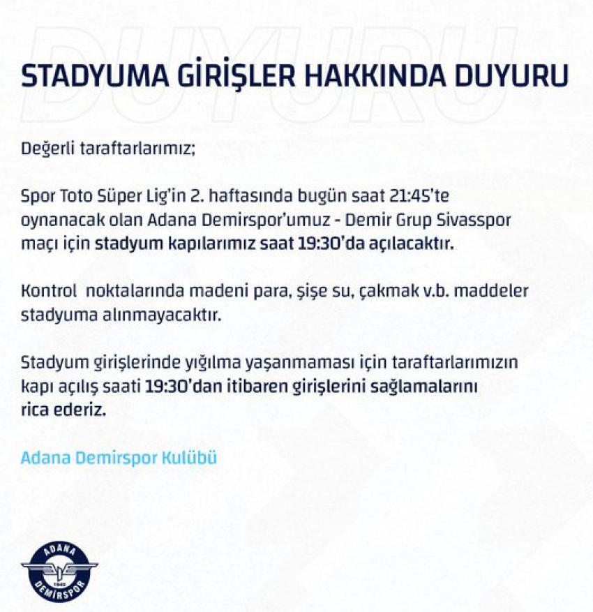 Spor Toto Süper Liğ’in 2.haftasında bugün saat 21.45’te oynanacak olan Adana Demirspor’umuz-Demir Grup Sivasspor maçı için stadyum kapılarımız saat 19.30’da açılacaktır.