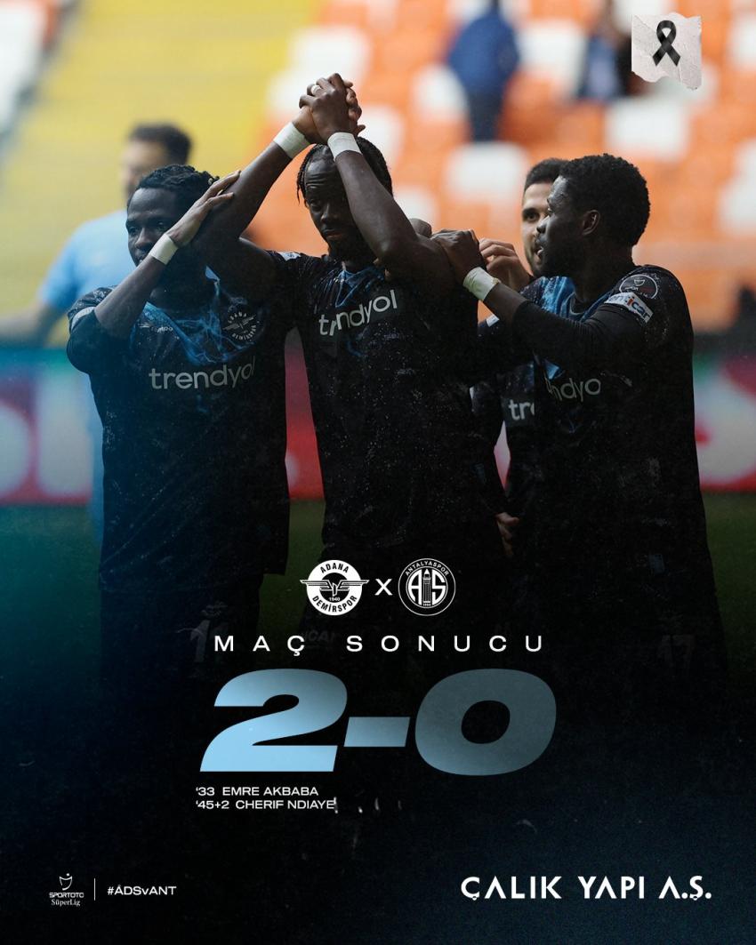 ADANA(HABER)-Süper Liğ'in 26. haftasında Adana Demirspor evinde misafir ettiği Antalyaspor'u 2-0 yendi. Adana Demirspor bu galibiyetle puanını 45 yaptı ve 4. sırada yer aldı. Antalyaspor ise 28 puanla 10. sırada yer aldı.