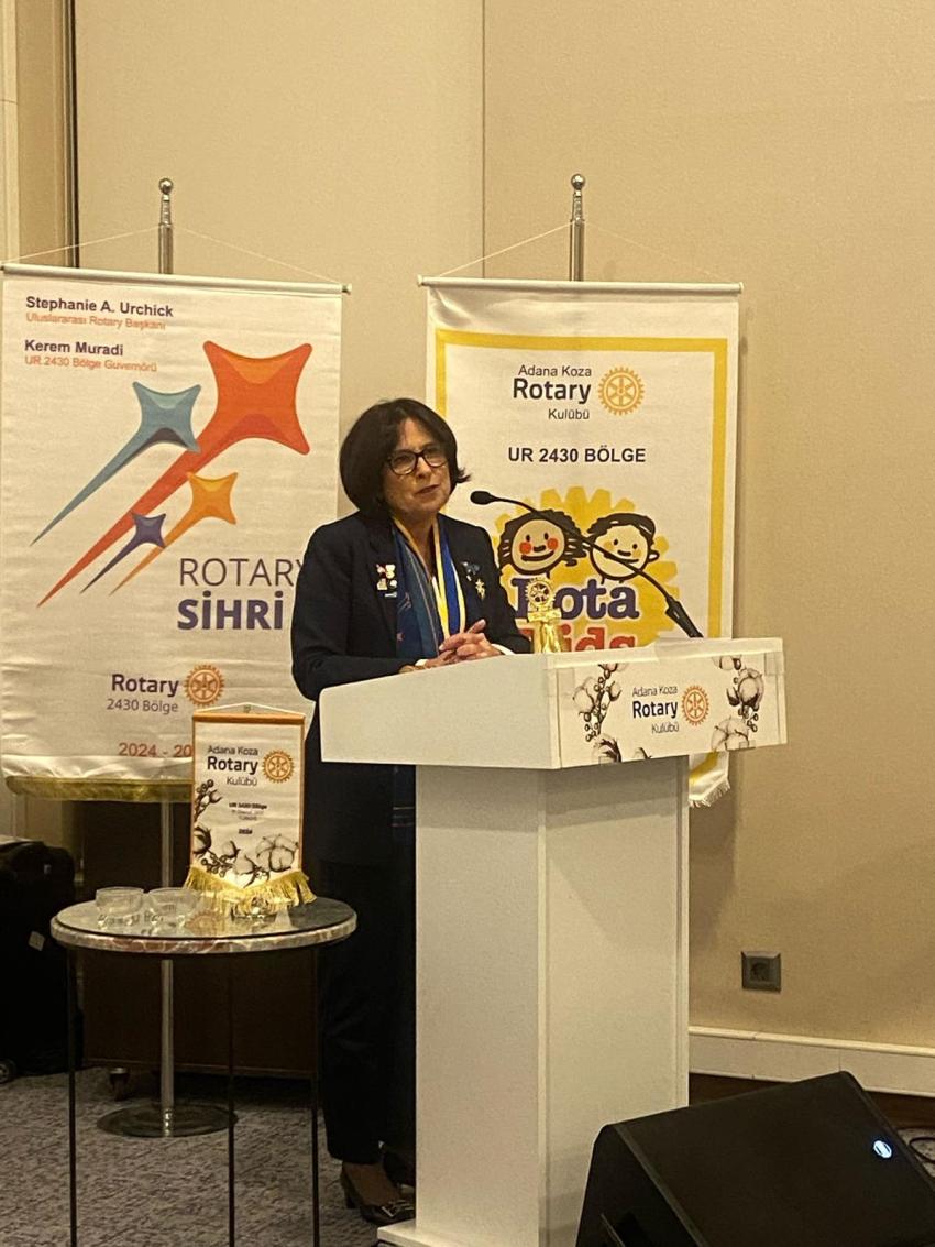 Adana Koza Rotary Kulübü Dönem Başkanı Tijen Türeli konuşmasında, “Kendinden Önce Hizmet” ideali ile Rotary kulüpleri çatısı altında birleşen iş ve meslek insanları olarak Rotaryenlerin, yaşadıkları toplum için sosyal sorumluluk bilinciyle çok çeşitli hizmet projesi ve etkinlikleri yaşama geçirdiğini vurguladı. Kendileri gibi, gönüllülükle ve özveriyle, toplum için, gençler, kadınlar, çocuklar için pek çok alanda emek veren ve ayrıca Adana Koza Rotary Kulübü hizmet proje ve etkinliklerine değerli katkılarıyla destek veren tüm kişi, kurum ve kuruluşlara teşekkür etti. Türeli, ayrıca emek yoğun etkinlik ve hizmet projelerinde uyumlu işbirliğinin, gönüllülüğün, özverinin, hoşgörünün, karşılıklı güvenin, paylaşımın ve ekip çalışmasının önemini vurguladı.