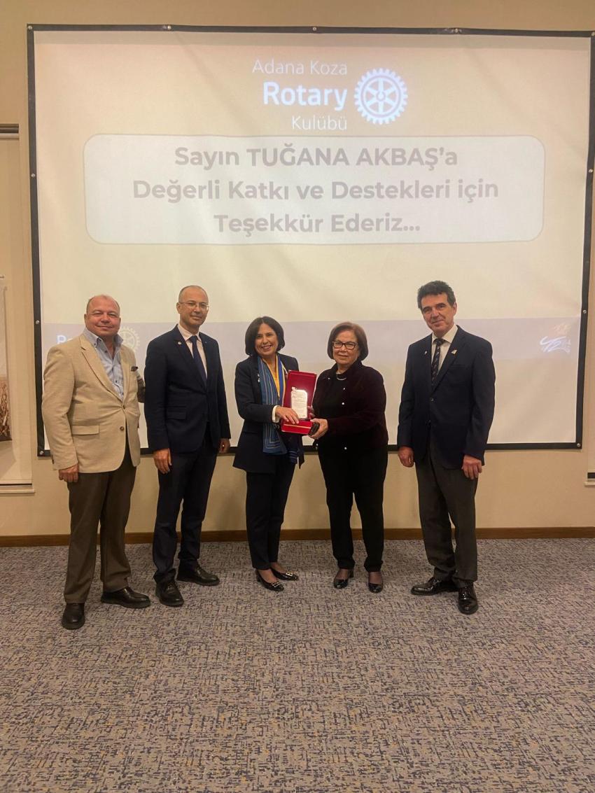 Duygusal anlar yaşanan dostluk dolu gecede Adana Koza Rotary Kulübünün farklı alanlardaki etkinlik ve hizmet projelerine destekleri, değerli katkıları ve uyumlu işbirliği teşekkürü olarak kurum ve kuruluş alanında Çağ Üniversitesi’ne, İstanbul Lider Koleji Adana Kampüsü’ne ve Türkiye Yardım Sevenler Derneği Adana Şubesine; bireysel alanda ise Doktor Öğretim Üyesi Tuğana Akbaş’a teşekkür plaketleri takdim edildi.