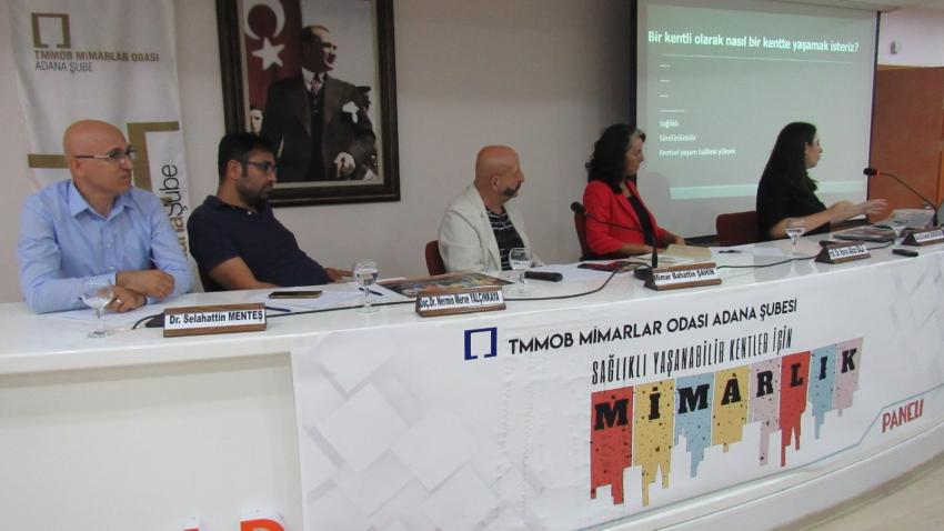 Dünya mimarlarının bu yıl ‘Esenlik İçin Mimarlık’ temasıyla kutladığı 3 Ekim Dünya Mimarlar Günü çerçevesinde etkinliklerini sürdüren TMMOB Mimarlar Odası Adana Şubesi’nin, Eczacılar Odası Konferans Salonu’nda düzenlediği panelde 4 bilim insanı kendi alanından başlıklar üzerinden ‘’Adana’da sağlıklı ve yaşanabilir kent modeli’’ sunumu gerçekleştirdi.