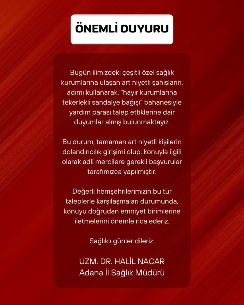 Adana İl Sağlık Müdürü Uzm. Dr. Halil Nacar, adının kullanılarak gelen bağış taleplerine itibar edilmemesini isteyip vatandaşları dolandırıcılara karşı uyardı.