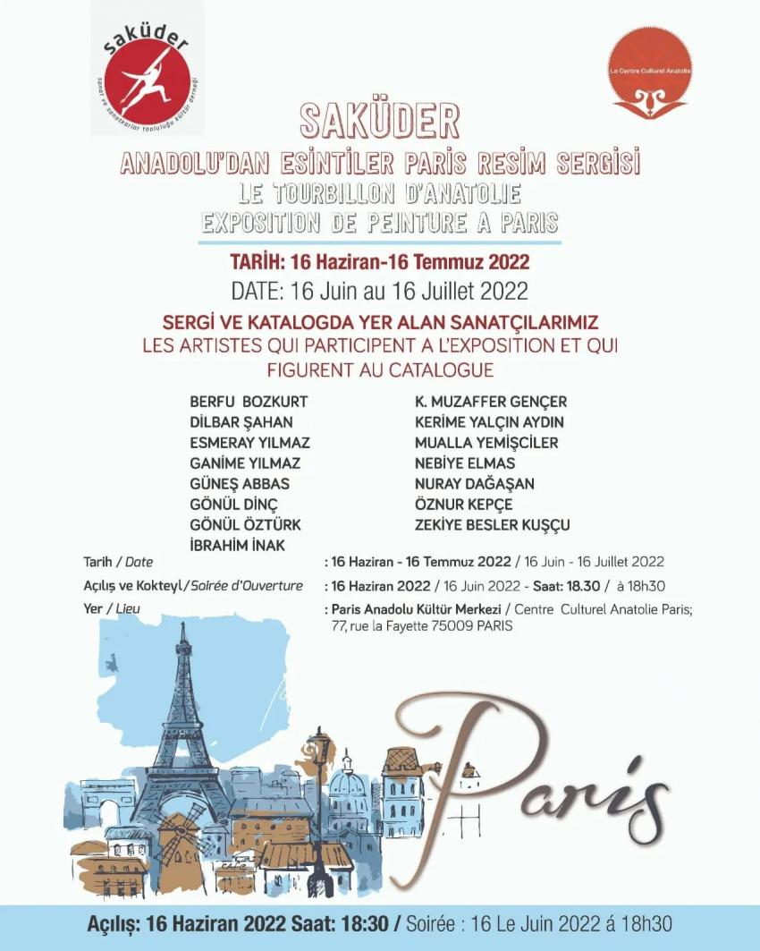 Uluslararası Sanat ve Sanatkarlar Topluluğu Kültür Derneği SAKÜDER’in Kuruluşunun 17. Yılında geleneksel olarak 5’nci kez düzenleyeceği “Anadolu’dan Esintiler” resim sergisi 16 Haziran’da Paris’te açılacak.