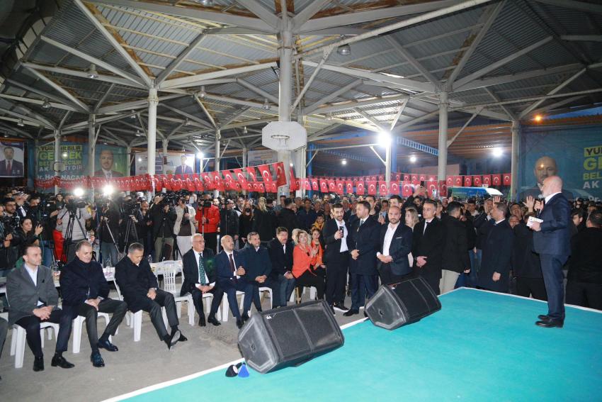 Adana Cumhurbaşkanımızı külliyeye gönderdi Türkiye’nin huzuru yerelde başlıyor yani belediyelerde başlıyor huzur. Yüreğir’de Fatih Mehmet Kocaispir kardeşimizin ne yaptığını biliyoruz. Belediyeyi emanet ettiğiniz kişi Şehremini, samimi, kararlı, azimli gece gündüz demeden çalışan ortaya eser çıkınca ben değil biz diyen biri olmalı. Fatih kardeşimizden sonra Halil Nacar başkanımız inşallah Yüreğir’de şehremini olacak. Allah bizi size mahçup etmesin. 31 Mart günü gözünüzü yumup kalbinizi dinleyip şehremini kim olacak karar vereceksiniz. On saniyede bastığınız mührün 5 yıl telafisi yok. Bizim arkadaşlarımız size gece gündüz hizmet edecekler biz buna talibiz” ifadelerini kullandı. Yerlikaya, “Yüreğir’de Dr. Nacar’ı seçin, biz de yanında olalım ve destekleyelim. Yüreğir’in hayalleri gerçek olsun” ifadelerini kullandı.