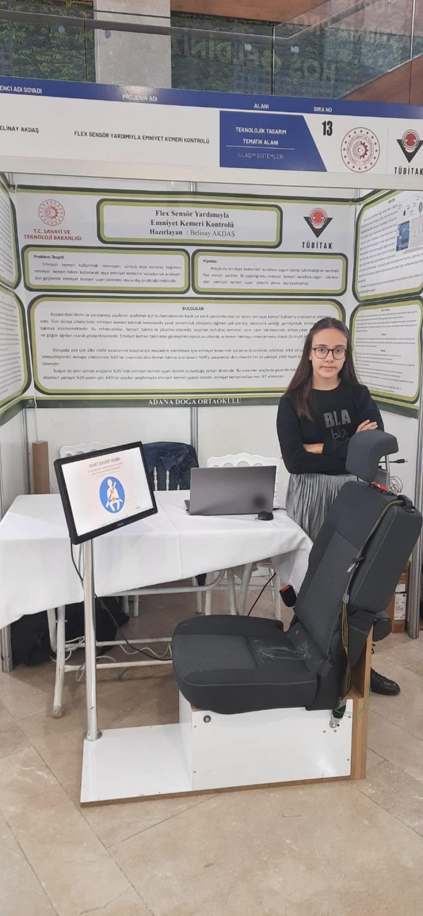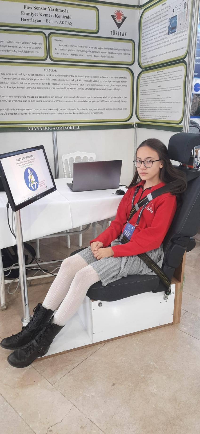 Belinay Akdaş’ın Türkiye birincisi olan projesinin amacı; insanlarda emniyet kemeri takma oranının artırılması ve kaza anında ölüm ve yaralanma sayısının azaltılması. Proje ürünü ise şu şekilde: Projede karın ve göğüs bölgesine gelecek şekilde 2 adet flex sensörü bulunmakta. Bu sensörler bükülebiliyor ve bükülme değeri ölçülebiliyor. Bükülme değerinden faydalanılarak emniyet kemerinin kurallara uygun bir şekilde kullanılması sağlanıyor.