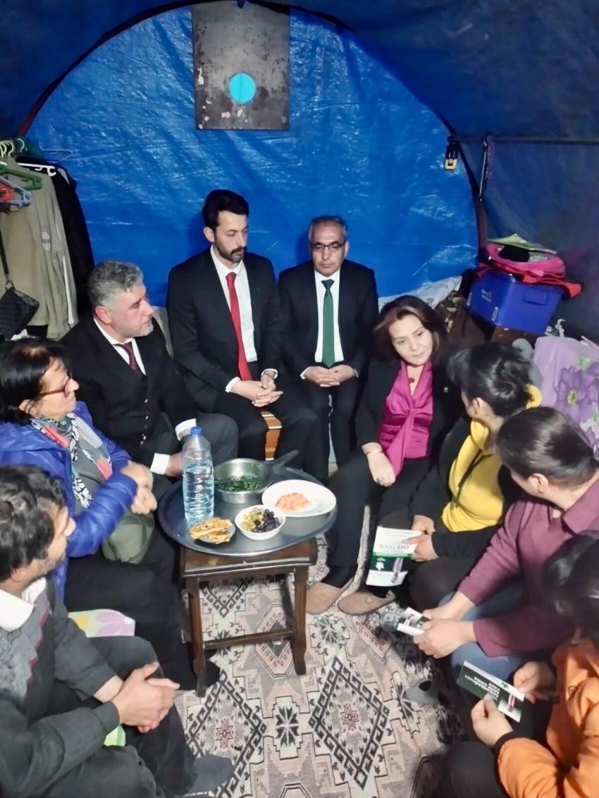“Seçim çalışmaları yaparken çok acı tablolarla karşılaştım. Ayağında çorap olmayan çocuklar, kendisine iki üç beden büyük veya küçük gelen pantolonlarla dolaşan vatandaşlar, depremde kaybettiği eşinin, çocuklarının acısıyla canlı cenazeye dönüşmüş insanlar, internet için can atan çocuklar, gençler, gördüm.Depremzedelerimiz korkunç bir yalnızlık, yoksulluk ve yokluk içinde. Bir kaç metrekarelik konteynırlara, çadırlara terk edilmiş, unutulmuş haldeler. Samandağ’da konteynır kentleri ve çadırları dolaşırken iftar vakti yaklaşmıştı, ‘şuraya da girelim sonra iftar yapacağımız bir lokanta bulalım’ derken. Bu aile buyur etti, sofrada sahurdan kaldığı söylenen biraz menemen, ıspanak kavurması, küçük bir kase zeytin, su ve ekmek vardı, başka hiç birşey yoktu. Depremzedelere yapılan maddi yardımlardan da faydalanamadıklarını söylüyorlardı. Bu iftar sofrasını görünce aileye belli etmemeye çalışsakta boğazımız düğümlendi, büyük bir üzüntü duyduk, gözlerimizin dolmasına engel olamadık. Depremzedelerimizin böylesine büyük bir yokluğa, açlığa, mahkum edilmesi bizleri derinden üzdü…