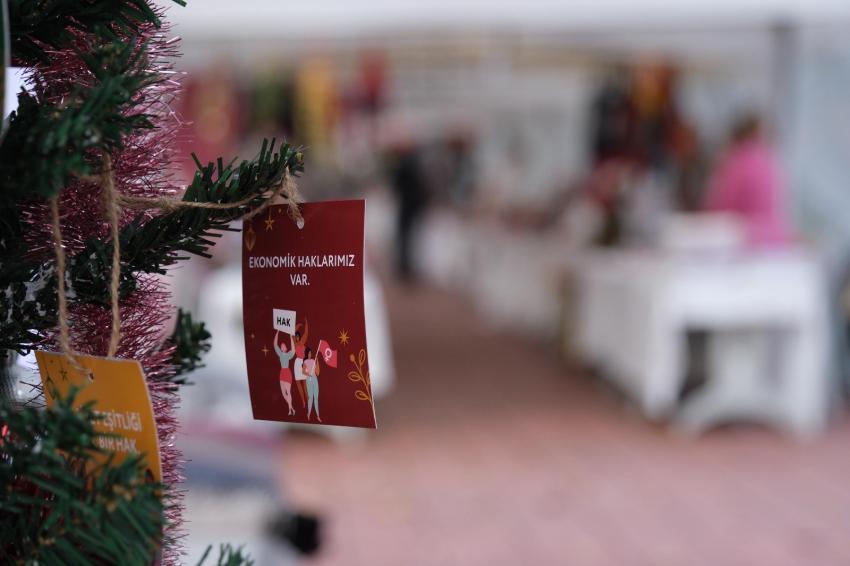 Kadın Emeği Pazarı’nda kurulan yılbaşı ağacına, kadın daire tarafından toplumsal cinsiyet eşitliğine vurgu yapmak için hazırlanan kartlar, üretici kadınlar ve ziyaretçiler tarafından asıldı.