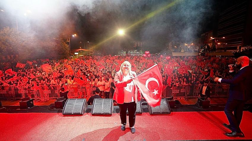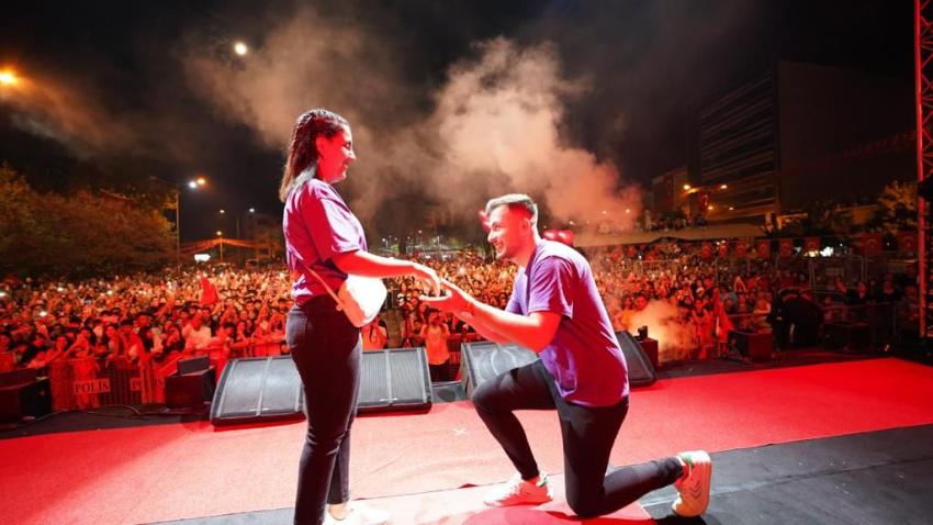 Ceyhan Belediyesi’nin düzenlediği ve muhteşem bir atmosfere sahne olan Ceyhan’daki Cumhuriyet Bayramı konserinde bir de sürpriz yaşandı. Ramazan Gümüş isimli genç, sahneye çıkarak kız arkadaşı Dilan’a sürpriz bir evlilik teklifi gerçekleştirdi. Cebinden çıkardığı yüzükle birlikte bir ömür Dilan İkiz’le hayat sürmek istediğini kaydeden ve “Benimle evlenir misin?” diyen Ramazan’a “Evet” yanıtı veren Dilan, binlerce Ceyhanlı tarafından uzun süre alkışlandı. Gençlere mutluluklar dileyen Hülya Erdem, “Umarım evlilik nikahınızı da ben kıyarım” diye konuştu.