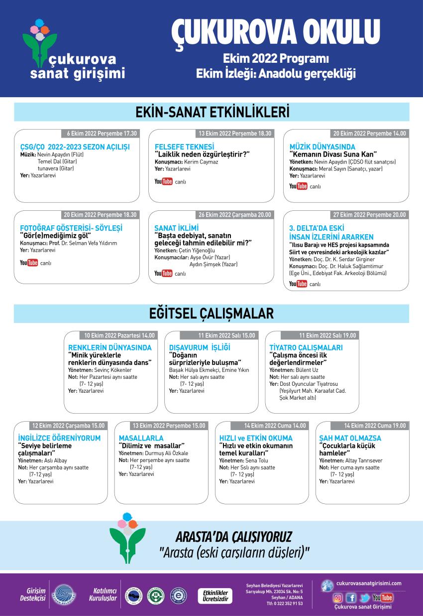 Çukurova Okulu’nda geçen yıllarda olduğu gibi bu yıl da, halk için arkeolojiden fotoğrafa, felsefeden edebiyata, müziğe türlü sanat disiplinleriyle ilgili etkinlikler, konferanslar, paneller düzenlenecek. Bu etkinlikler Yazarlarevi’nin yanısıra ÇSG’nin YouTube kanalından canlı olarak da yayımlanacak.