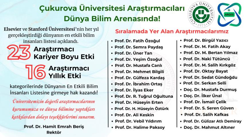 Elsevier ve Stanford Üniversitesinin her yıl gerçekleştirdiği dünyanın en etkili bilim insanları listesi açıklandı. Çukurova Üniversitesi listede, “Kariyer Boyu Etki” kategorisinde 23, “Yıllık Etki” kategorisinde ise 16 akademisyeniyle yer aldı.