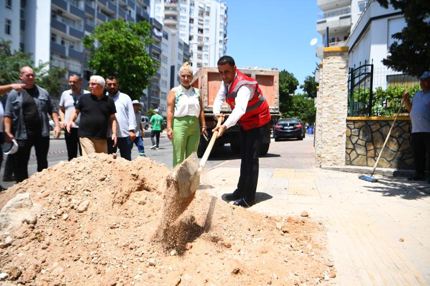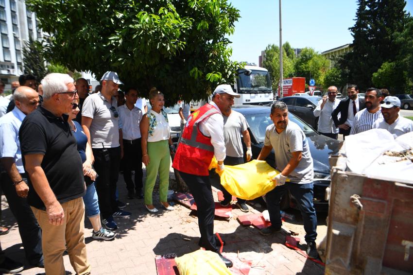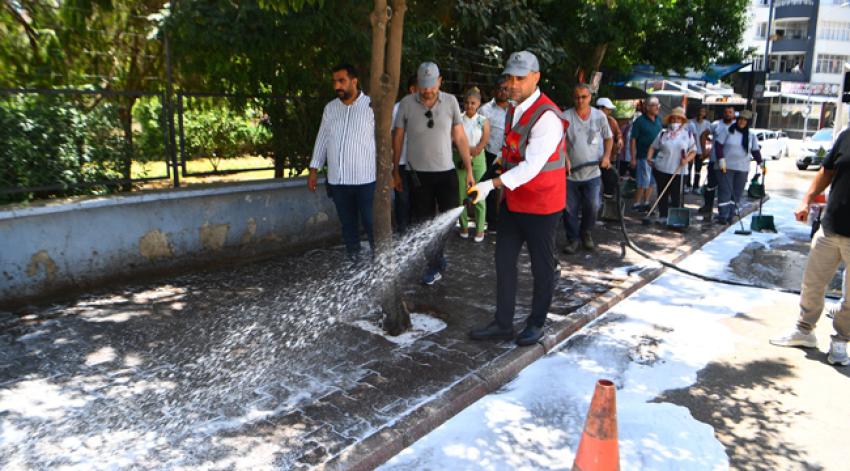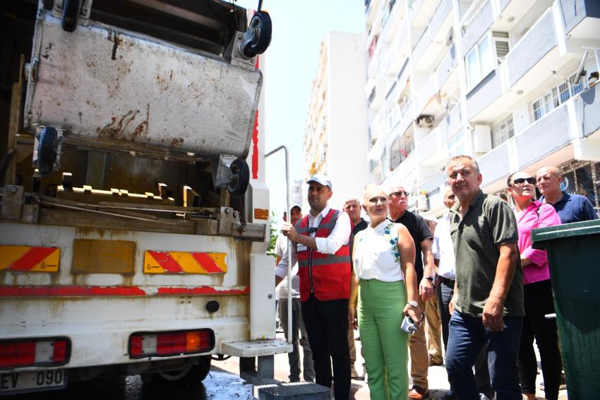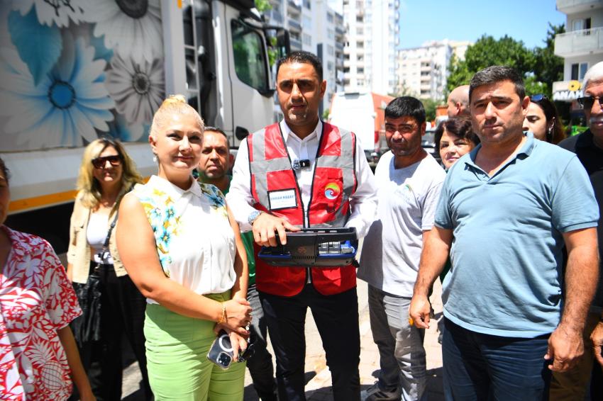 Kapatılan yer altı konteynerinin yerine yer üstü konteynerleri yerleştirilirken, Başkan Kozay konteyner yıkama çalışmalarını da denetledi. Süpürge aracıyla sokakları süpüren Başkan Kozay, arazözle mahalledeki sokakları portakal çiçeği kokulu suyla yıkadı.