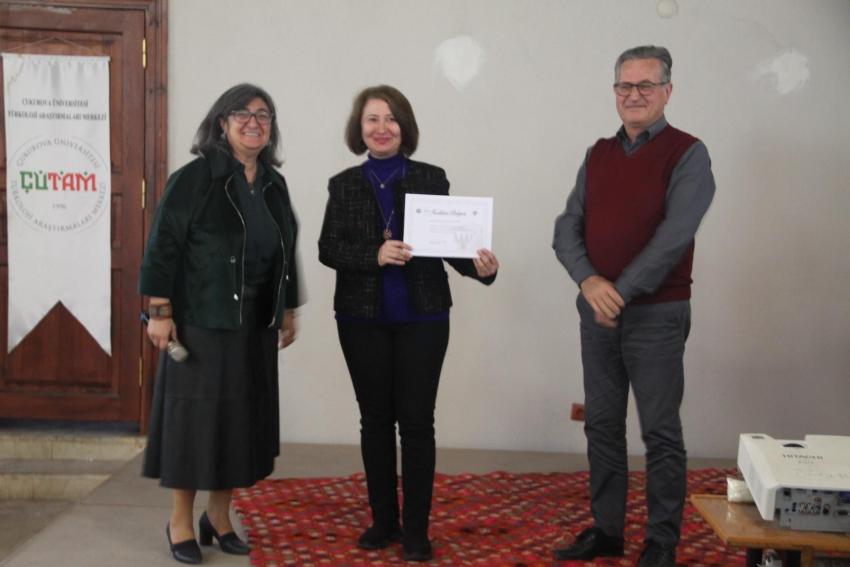 ÇÜTAM katılımcılarından gelen soruları yanıtlayan konuşmacılara toplantı sonunda katkı ve katılımlarından dolayı Merkez Müdürü Prof. Dr. Deniz Abik tarafından teşekkür belgesi takdim edildi.