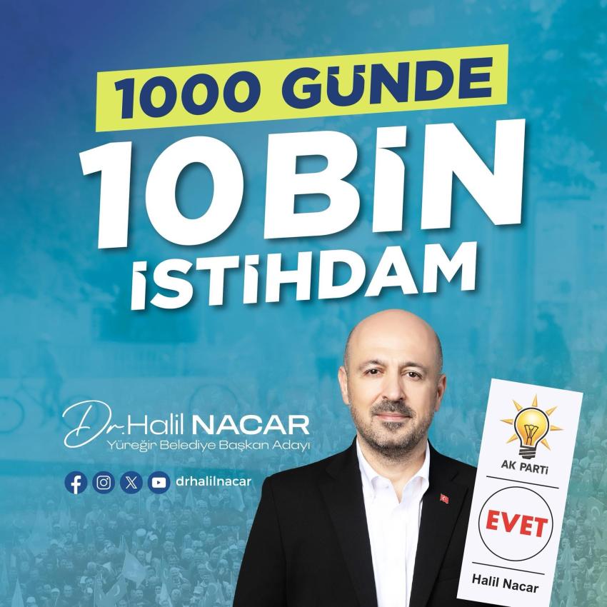 Cumhur İttifakı AK Parti Yüreğir Belediye başkan adayı Dr. Halil Nacar, Yüreğir’de bin günde 10 bin istihdam projesi için istihdam ofisi kurulduğunu belirtip, “Gençlerle ilgili, Yüreğir’in tamamıyla ilgili bizden çok ciddi istihdam talebi var. Yüreğir Belediyesi olarak bin günde 10 bin istihdam oluşturacağız. Yüreğir’de çalışmak isteyene, emeğiyle, alın teriyle para kazanmak isteyene, geleceğini kazanmak isteyenlere Yüreğir’de iş var. Bunun için işverenlerimizle, sektör temsilcilerimizle, ilgili kamu kurumlarıyla ve belediyemizle ortak çalışmalarımızı yaptık ve hazır. Bin günde 10 bin istihdam oluşturacağız” dedi.