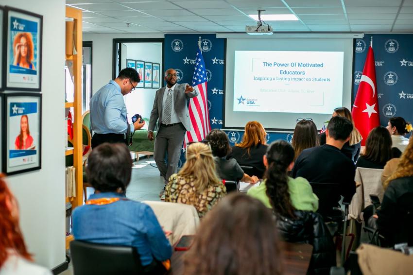 EducationUSA Adana Ofisi, Uluslararası Eğitim Haftası çerçevesinde bölgemizden yaklaşık 30 öğretmeni tüm gün süren bir atölye çalışmasında ağırladı. Toplantı Ziyapaşa Bulvarındaki EducationUSA Adana ofisinde yapıldı. Diyarbakır, Kahramanmaraş , Antakya, İskenderun ve Adana’dan öğretmenlerin katılımıyla gerçekleşen toplantı Adana Amerikan Konsolosluğu Kamu Diplomasisi Müsteşarı Adam Benz’in konuşması ile açıldı. Gün boyu toplamda 5 farklı konumda sunumlar yapıldı. Hep beraber yenilen bir akşam yemeği ile toplantı sonlandı.
