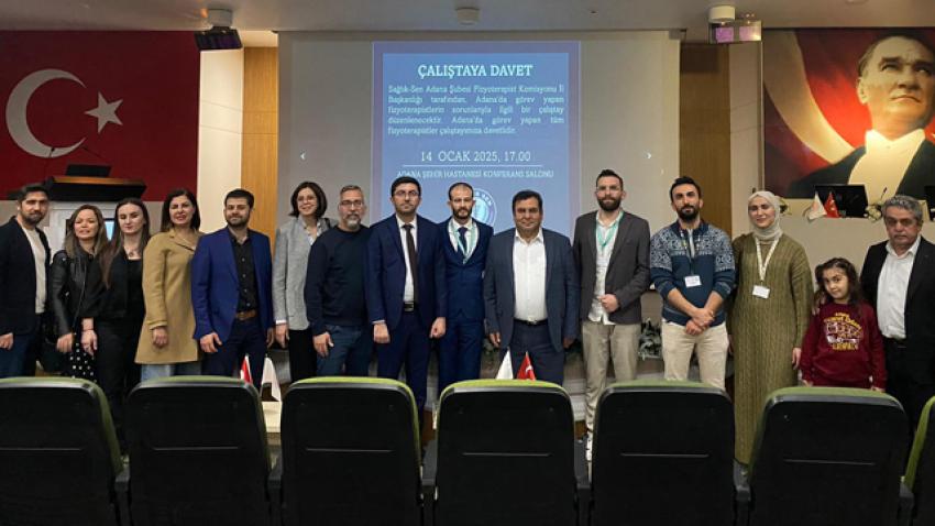 Sağlık-Sen Adana Şubesi Fizyoterapist Komisyonu İl Başkanlığı ve Türkiye Fizyoterapistler Derneği Adana İl Başkanlığı tarafından organize edilen çalıştaya Adana İl Sağlık Müdürü Uzm. Dr. Halil Nacar, Adana Şehir Hastanesi Başhekimi Doç. Dr. Mehmet Volkan Harput, Sağlık-Sen Adana Şube Başkanı Bekir Nennioğlu, Türkiye Fizyoterapistler Derneği Adana İl Başkanı Burak Kirkali, Sağlık-Sen yönetim kurulu üyeleri ve fizyoterapistler katıldı.