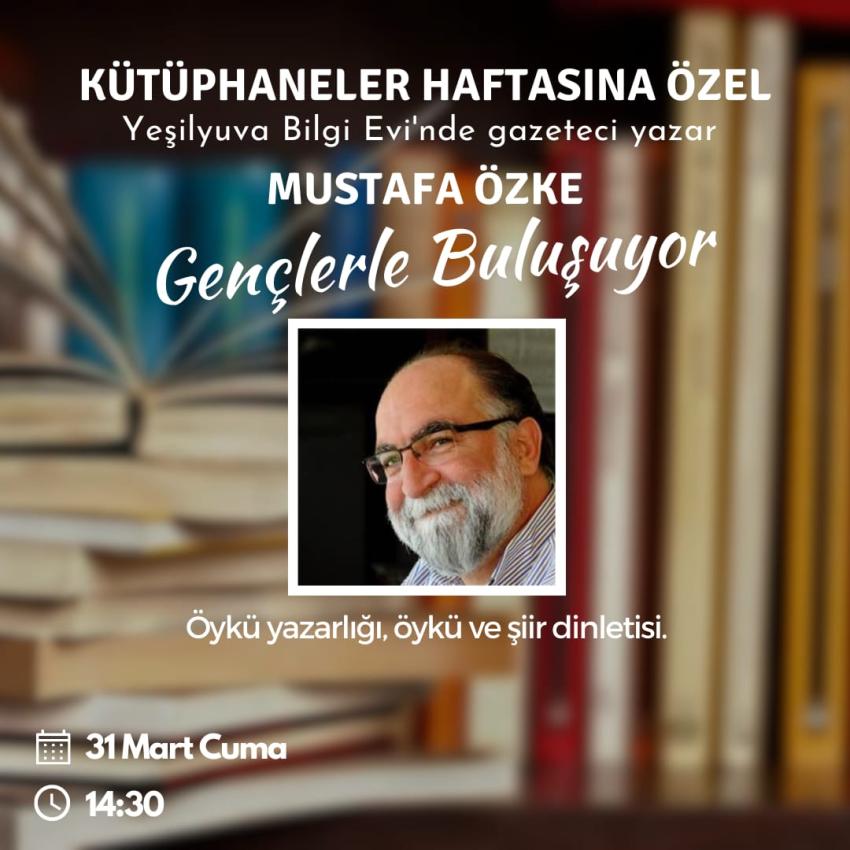 Gazeteci yazar Mustafa Özke, Kütüphaneler Haftası dolayısıyla Cuma günü (yarın) saat 14.30’da Yeşilyuva Bilgi Evi’nde gençlerle buluşacak.