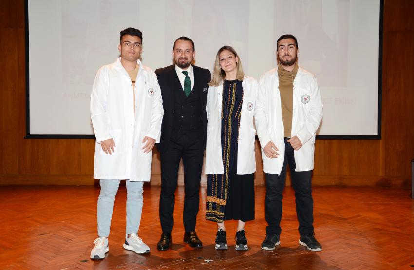 Doç. Dr. Yusuf Ziya Halefoğlu’nuın ‘Değişen Dünyada Öğrenciler’ konulu konferansın ardından Eczacılık Fakültesi Dekanı Prof. Dr. Kumcu ve akademisyenler ile Adana Eczacı Odası Başkanı Ecz. Yalbuzdağ ve YK Üyeleri genç eczacılara önlüklerini giydirdi.