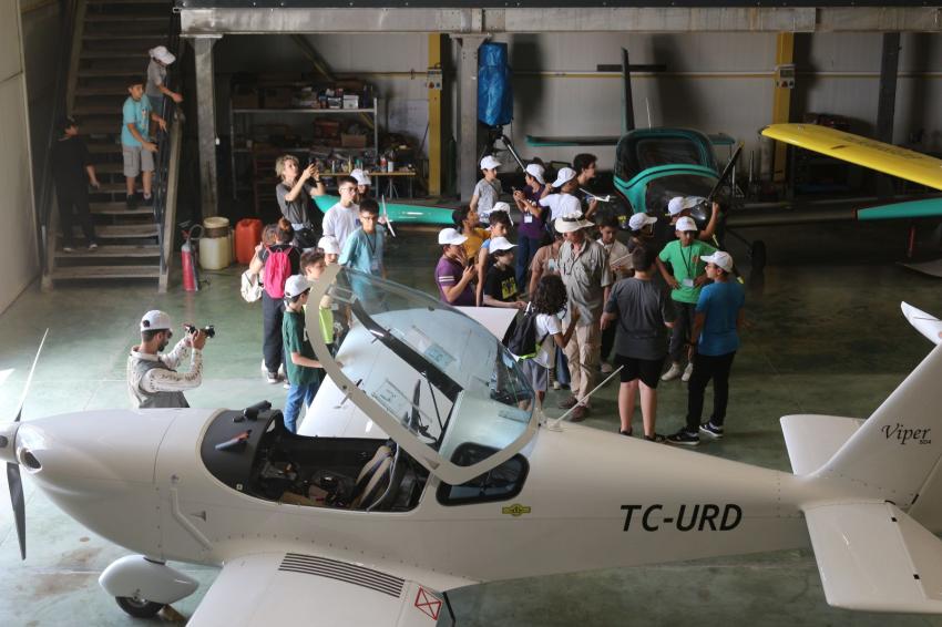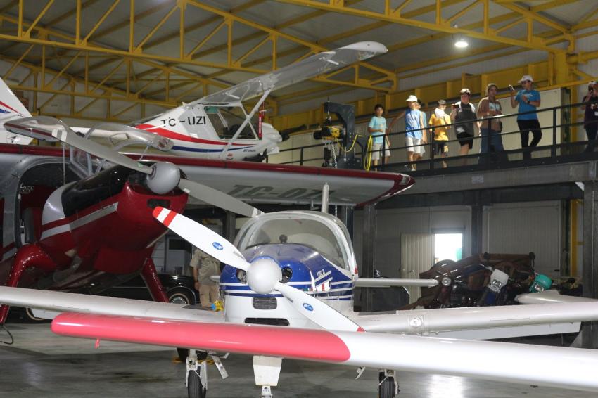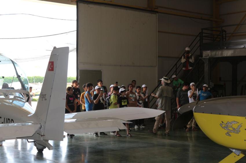 Havacılığa ilk adımı atan gençler daha sonra uçak hangarındaki uçaklar hakkında bilgi aldılar.