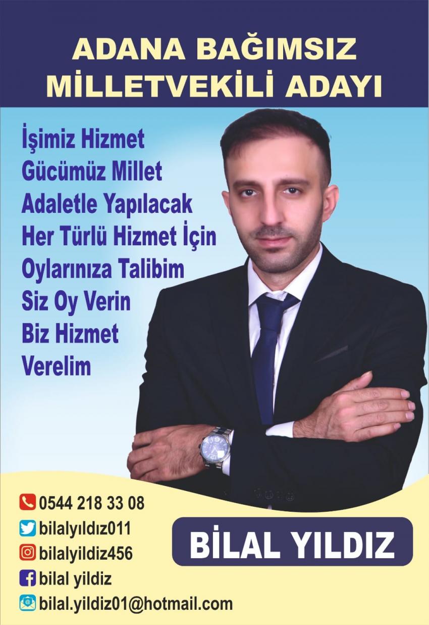 Adana’da turizm ve nakliye işinin yanı sıra otel işletmeciliği yapan Bağımsız Adana Milletvekili Adayı Bilal Yıldız, aslen Batmanlı olduğunu ancak uzun yıllardır Adana’da yaşadığını söyledi. “Yıllarca Adana’nın ekmeğini yedim. Genç yaşta bir çok tecrübe kazandım. Şimdi sıra Adanama hizmet etmek gibi bir misyonum var” diyen Milletvekili adayı Yıldız, neden milletvekili olmak istediğini şöyle anlattı: