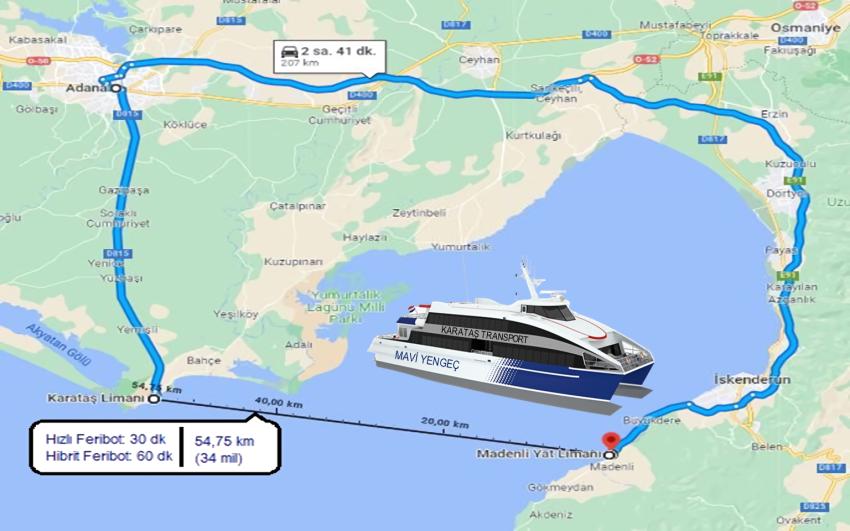 "Adana Karataş ile hedef bölge arasında açılacak yeni bir denizyolu turizm merkezi kapsamında, yurt içi ve yurt dışı ağlar sayesinde, modern taşımacılığa uygun, gelişmiş, konforlu ve hızlı yolcu/arabalı gemilerin feribotların hizmete alınacak, Karataş'a turistik gemilerin uğraması için bir park ve bakım koşulları ile ilgili fiziki üst yapı imkanları kazandırılacaktır. Örnek olarak; 65 deniz mili mesafesindeki Taşucu Girne hattı mevcut gemilerle ortalama 2 saat 30 dakika sürerken, 128 deniz mili mesafesindeki Karataş-Gazi Mağusa arası yolculuk alınacak modern feribotlarla 2 saatin altında gerçekleşebilecektir. Karataş Limanı ile Arsuz Madenli Limanı arasındaki 207 kilometrelik ve 2 saat 40 dakikalık karayolu mesafesi, karşılıklı deniz otobüsü seferleri ile 34 mile ve 30 dakikaya indirilebilecektir.