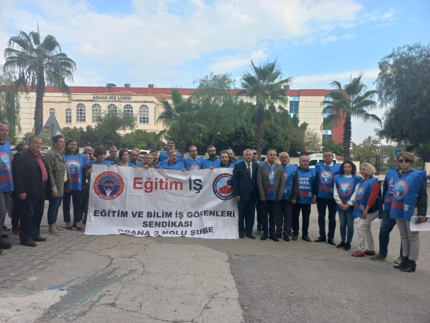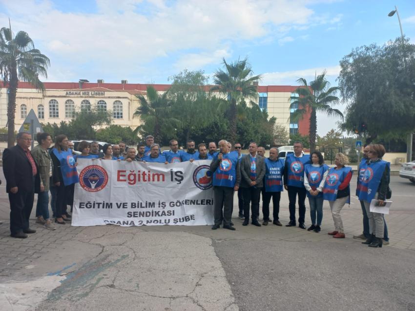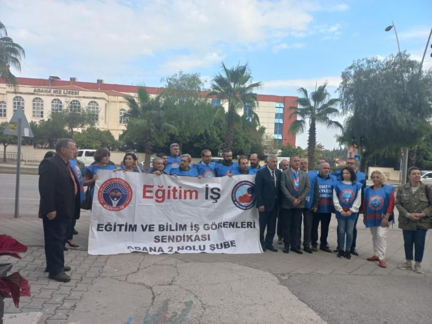 Eğitim İş Adana 2 No'lu Şube Başkanı Emin Erkan Şenol ve sendika üyeleri, Adana Kız Lisesi’nde görevli 3 idarecinin görevlerinden uzaklaştırılmalarına tepki gösterdi.