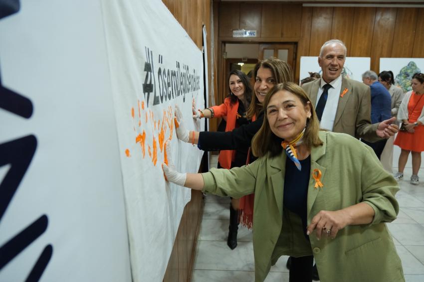 Farkındalık çalışmaları kapsamında, hafta boyunca turuncu rengin öne çıkarılacağı duyurusuyla hazırlanan “Lösemi Değil, Sevgi Bulaşır” yazılı bez pankarta, katılımcılar ellerini turuncu boyaya batırarak iz bıraktı.