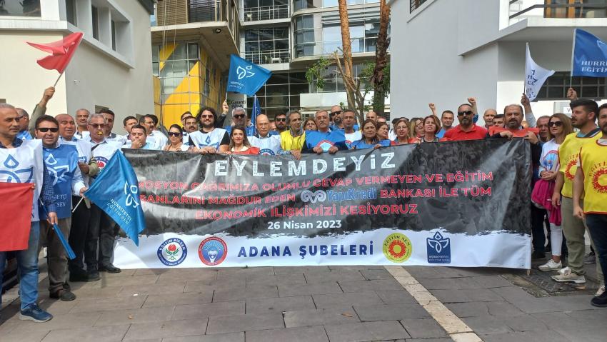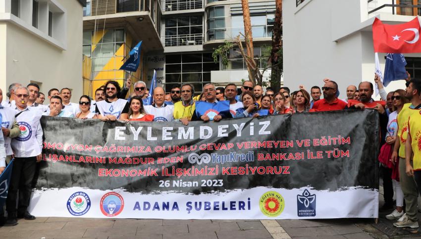 Eğitim Sendikaları, eğitim çalışanlarının promosyonları için ortak eylem yaptı. Eğitim-İş Adana 1 Nolu Şube Başkanı Seher Ergin eylemde yaptığı açıklamada, “Söz tükendi, şimdi eylem vakti. Eğitim çalışanları adına uzun süredir yaptığımız çağrılara kayıtsız kalan Yapı Kredi Bankası ile tüm ekonomik ilişkilerimizi kesiyoruz” dedi.