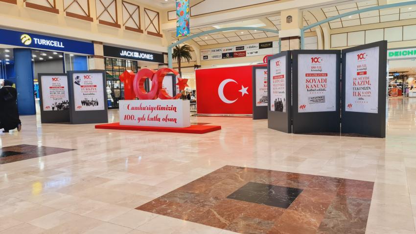 Alışveriş merkezinde Ekim ayı başından bu yana açık olan; “CUMHURİYETİMİZ’İN 100 YILLIK KRONOLOJİSİ” sergisi gün boyunca ziyaretçiler tarafından ilgiyle izleniyor. Ayrıca AVM’nin açık ve kapalı alanlarında hazırlanan iki adet dev 100. Yıl logosu ziyaretçilerin birlikte anı fotoğrafı çektirmesi için sergileniyor.