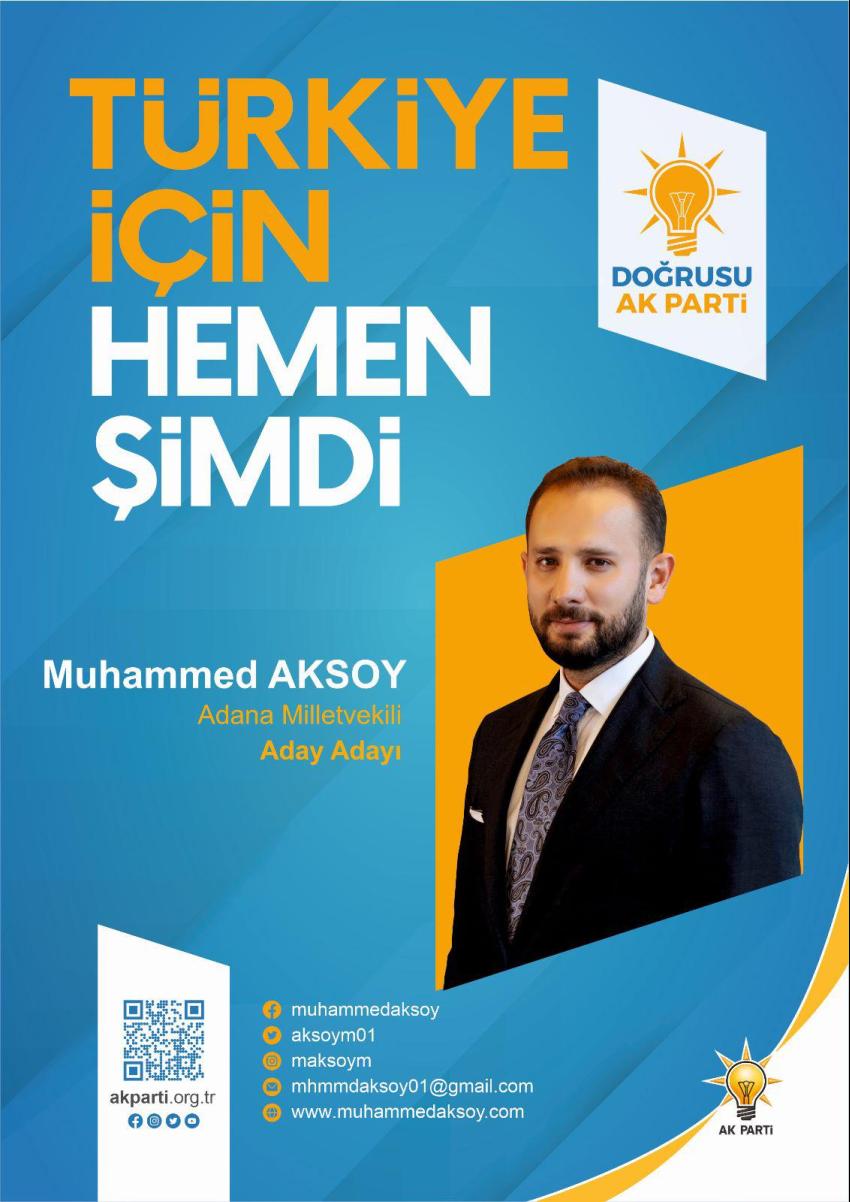AK Parti Adana il teşkilatında mahalle temsilciliğinden başlayarak, Seyhan ilçe gençlik kolları başkanlığı, il gençlik kolları başkan yardımcılığı, Seyhan Belediye Meclis üyeliği yaptıktan sonda 27.Dönem Milletvekilliği seçimlerinde 7. Sıradan aday gösterilen AK Parti Adana Milletvekili Aday Adayı iş adamı Muhammed Aksoy bu kez milletvekili seçilmek için çalışmalarını hızlandırdı.