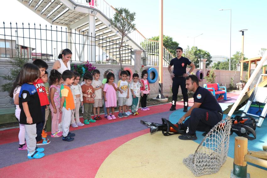 Yaşları 03 - 06 arasında değişen çocuklara yangından korunma, önlemler ve alınacak olan tedbirleri anlatan ekipler, yangın söndürme materyallerini de tanıtarak öğrencilere, çakmak ve kibrit gibi yanıcı ve parlayıcı maddelerle oynamamaları konusunda uyarılarda bulunuldu.