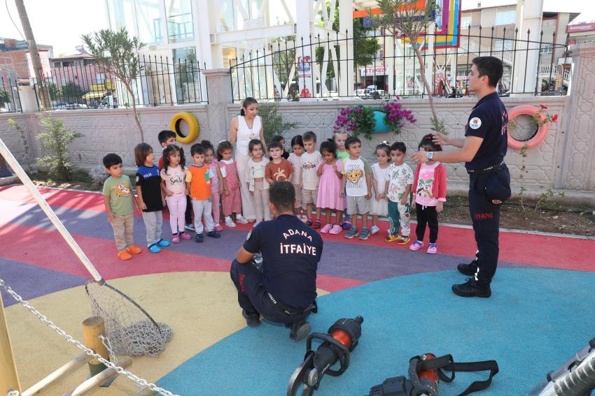Yüreğir Belediyesi’ne bağlı Minik Yürekler Kreşi’nde çocuklara yangın tehlikelerine karşı bilinç oluşturmak amacıyla itfaiye eğitimi verildi.