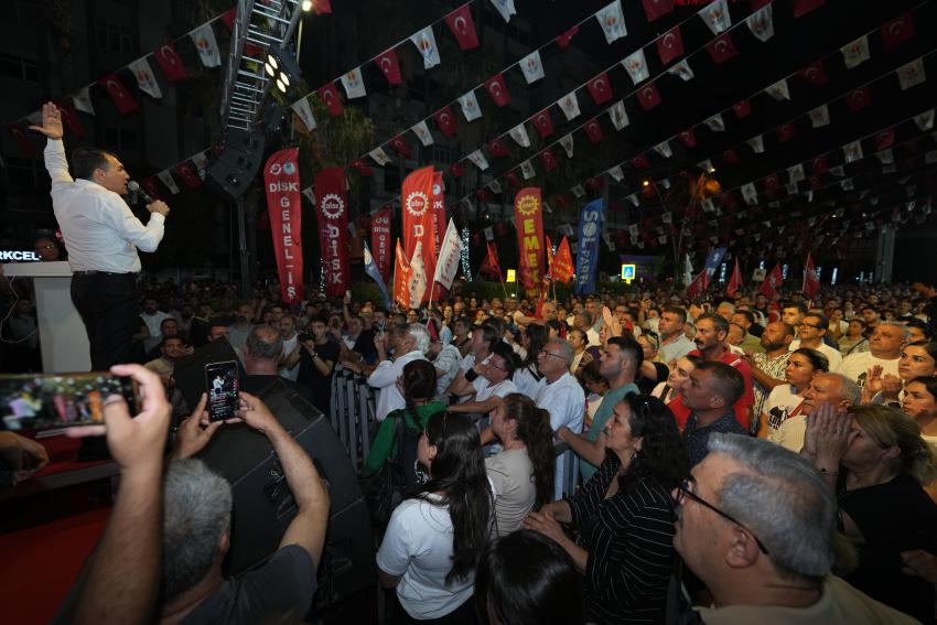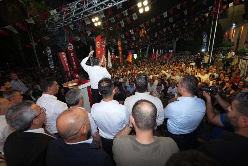 “Buradaki kalabalığı katlamaya söz veriyor musunuz? Adana’nın tüm kapılarını çalmaya, Zeydan Başkan’ın selamını taşımaya, direnmeye, ses çıkarmaya, ayakta durmaya, genel başkanımızı karşılamaya söz veriyor musunuz?”