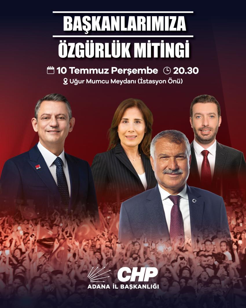 Haksız ve hukuka aykırı bir şekilde tutuklanan Adana Büyükşehir Belediye Başkanı Zeydan Karalar’a destek için düzenlenen “Adana İradesine Sahip Çıkıyor” mitingine Şanlıurfa milletvekili Mahmut Tanal, Gaziantep Milletvekili Hasan Öztürkmen, Mersin Milletvekili Talat Dinçer, Çankaya eski Belediye Başkanı Alper Taşdelen, CHP Mersin, Hatay, Gaziantep ve Osmaniye il başkanları, CHP’li ilçe belediye başkanları, CHP Adana İl Örgütü, Zeydan Karalar’ın ailesi, bazı siyasi partiler, sivil toplum örgütleri, sendikalar ve vatandaşlar katıldı.