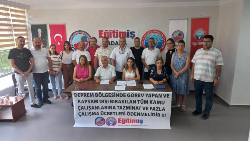 Birleşik Kamu-İş Konfederasyonuna bağlı Eğitim-İş Adana Şubeleri adına 1 No'lu Şube Başkanı Seher Ergin ve 2 No'lu Şube Başkanı Emin Erkan Şenol yaptıkları açıklamada deprem bölgesinde görev yapan tüm kamu çalışanlarına tazminat ve fazla çalışma ücretlerinin ödenmesi gerektiğini söyledi.