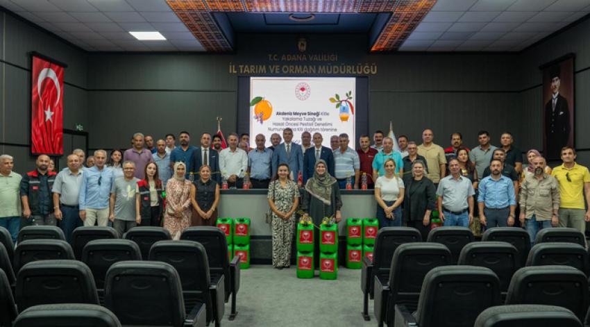 Programda daha sonda Adana İl Tarım ve Orman Müdürü Atilla Bayazıt ile Adana Ticaret Borsası Başkanı Şahin Bilgiç tarafından üreticilere Akdeniz Meyve Sineği Kitle Yakalama Tuzakları dağıtıldı.