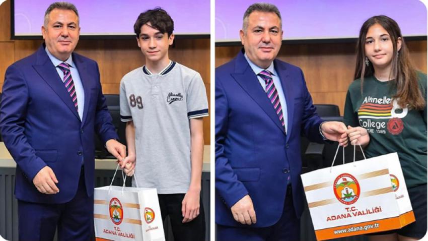 Adana Altıneller Okulları’nın LGS’de 500 tam puan alarak Türkiye birincisi olan öğrencileri Ege Haytoğlu ve Öykü Su Öztürk Vali Dr. Süleyman Elban tarafından ödüllendirildi.