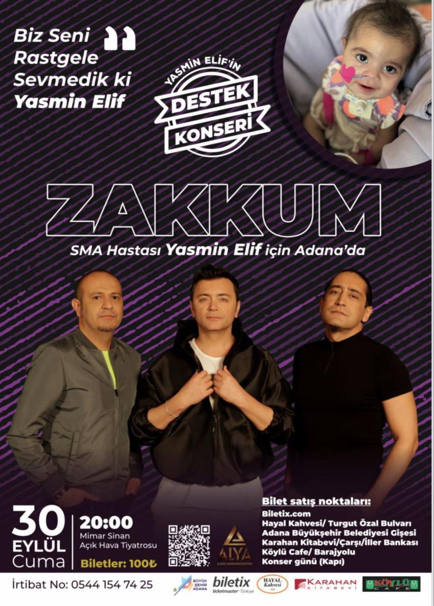 Adana’da yaşayan, nisan ayında İstanbul'dan tedaviden dönerken kendisini taşıyan ambulansın kontrolden çıkıp devrilmesi sonucu ölümden dönen SMA hastası 1 yaşındaki Yasmin Elif Salman için Zakkum grubu 30 Eylül'de konser verecek. Şarkılarını minik Yasmin için seslendirecek olan Zakkum'un konserinden elde edilecek gelirin tamamı Yasmin Elif’in 'zolgensma' gen tedavisi için başlatılan yardım kampanyasına aktarılacak.