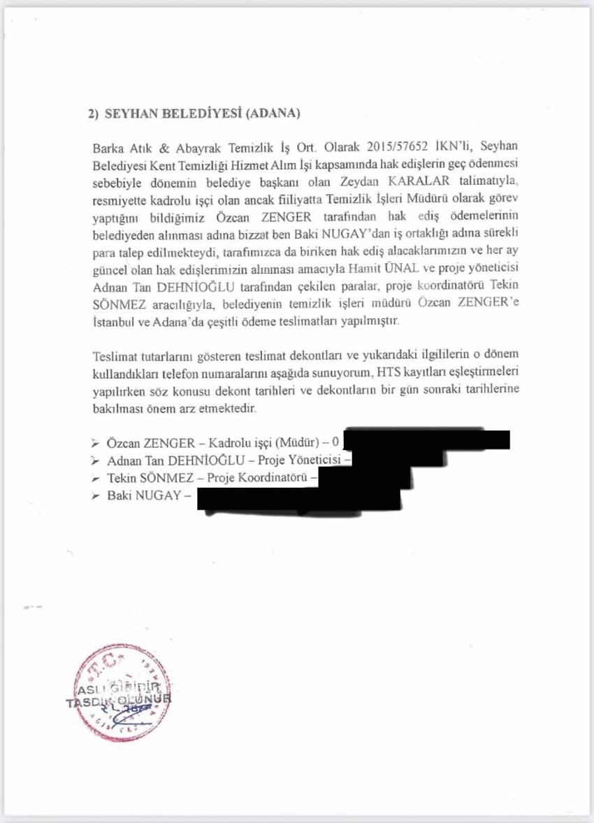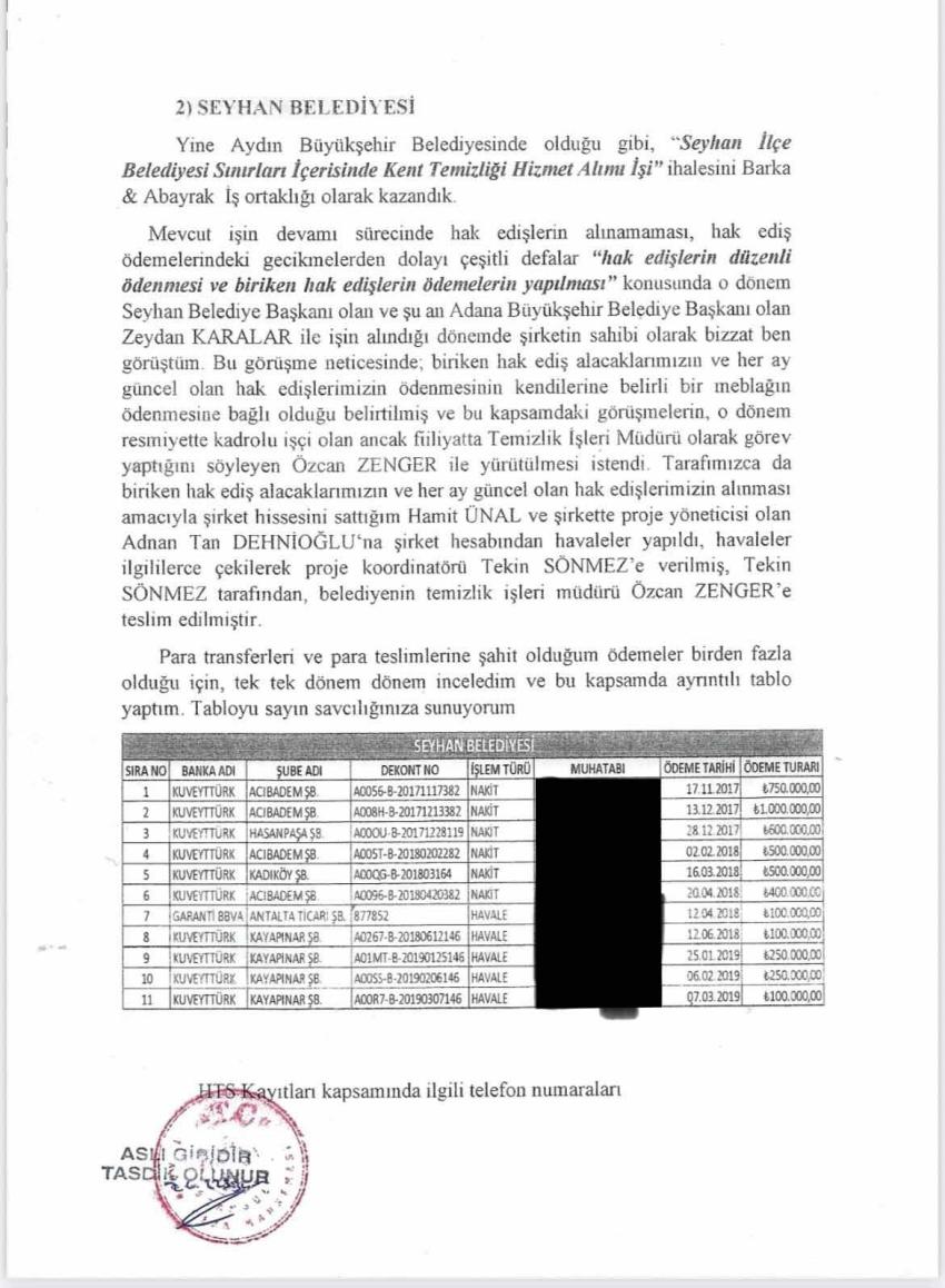 (Bu belgelerin ilkinde “belediyede kadrolu işçi (...)Ö.Z. tarafından hak ediş ödemeleri adına bizzat benden sürekli para talep edilmekteydi” şeklinde bir ibare yer almaktadır; oysa B.N. soruşturmadaki ifadesinde sözde menfaat talebinin doğrudan Zeydan Karalar’dan geldiğini öne sürmektedir. Görece uzun olan diğer belgede ise bu kez “(...) hak ediş ödemelerindeki gecikmelerden dolayı çeşitli defalar (...) Zeydan Karalar ile bizzat ben görüştüm(...)“ yazılıdır. Oysa, soruşturma ifadesinde B.N.; “(..) Zeydan Karalar ile bizzat ben görüştüm. Zeydan Karalar bana düzenli ödeme alabilmemiz için her ay belli bir miktarın kendilerine ödenmesi gerektiğini bu süreci temizlik isleri müdürü Ö.Z. ile yürütmemiz gerektiğini belirtti” demektedir. Bu metinde yer alan beyanı ile söz konusu imzasız metinlerden uzun olanı kısmen benzer olmakla birlikte, uzun metindeki “çeşitli defalar görüşme iddiası" değiştirilip “tekile indirilmiş”, “belirli bir meblağ” ifadeside “her ay belli bir miktarın ödenmesi” şeklinde değiştirilmiştir. “2-) Seyhan Belediyesi’ başlıklı bu iki metin içerikleri birbirleri ile olduğu gibi ifade metni ile de çelişmekte ve B.N.’nin ifadelerine itibar edilmeyeceğini kanıtlamaktadır.
