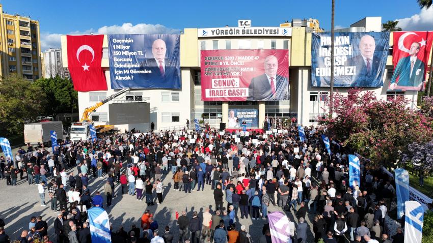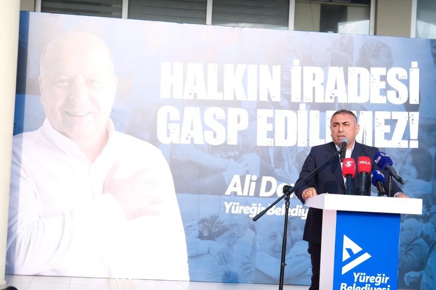 8 yıl önce bir davadan dolayı İçişleri Bakanlığı tarafından görevden uzaklaştırma kararı verilen CHP’li Yüreğir Belediye Başkanı Ali Demirçalı’ya destek vermek için binlerce Adanalı Yüreğir Belediyesi önünde bir araya geldi. Bakanlığın verdiği karar protesto edildi. Belediye önünde düzenlenen geniş katılımlı basın açıklaması saygı duruşu ve İstiklal Marşı’nın okunmasıyla başladı. Açıklamaya CHP Genel Başkan Yardımcısı Burhanettin Bulut, Adana Büyükşehir Belediye Başkanı Zeydan Karalar, Adana Büyükşehir Belediye Başkan Vekili Güngör Geçer, CHP Adana Milletvekilleri Müzeyyen Şevkin, Bilal Bilici, Orhan Sümer ve Ayhan Barut, CHP İlçe belediye başkanları, Kadirli Belediye Başkanı Mustafa Mert Olcar, CHP ilçe başkanları, meclis üyeleri, partililer ve Yüreğirli vatandaşlar katıldı.