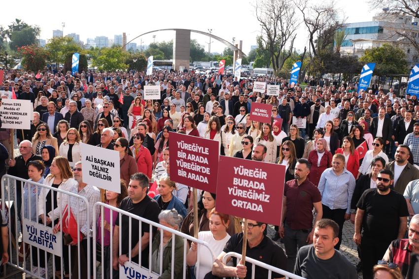 “PARTİMİZ VE BELEDİYELERİMİZ KUŞATMA ALTINDA” Tüm Türkiye’de uygulanan hukuksuzluk dün Yüreğir’e sıçramıştır. Cumhuriyet Halk Partili Belediyelere yönelik yapılan hukuksuz operasyonlara Yüreğir Belediyesinin de eklendiğini belirten başkan Demirçalı konuşmasını şu şekilde sürdürdü: “Partimiz ve Belediyelerimiz ağır ve haksız bir kuşatma altındadır. Yüreğir Belediyesi de bu kuşatmanın bir parçası haline getirilmiştir. Yapılan açık bir irade gaspıdır. Çünkü görevden uzaklaştırma kararı için yasal bir kılıf dahi bulamamışlardır. Bu kararı kabul etmemiz mümkün değildir. Halkın iradesinin gasp edilmesine izin veremeyiz. Mücadelemizi her alanda yükselterek yolumuza devam edeceğiz.”