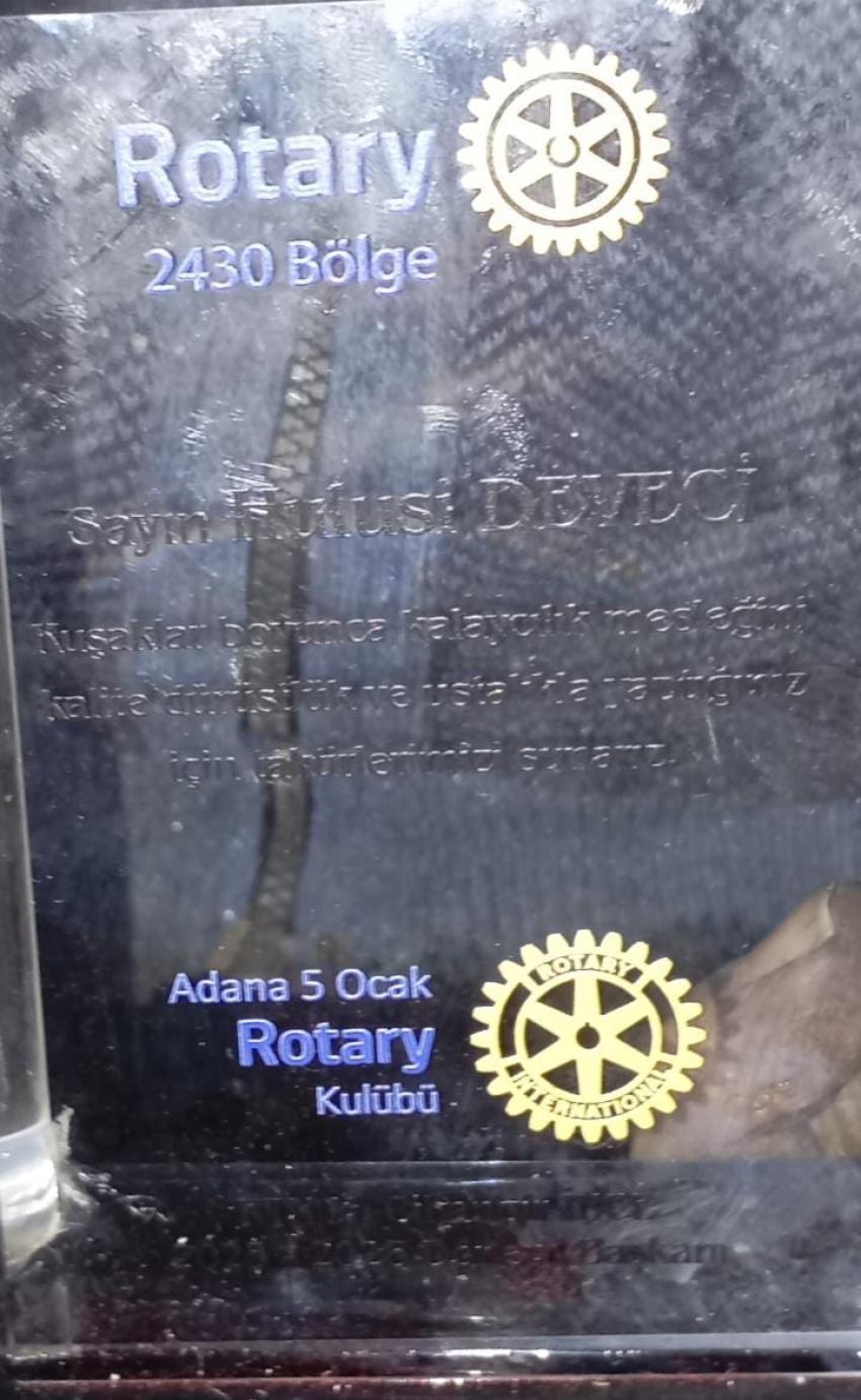 Kalayacılık Mesleğinin Efsane Ustası Hulusi Deveci'ye Adana 5 Ocak Rotary Kulübünden takdir ödülü plaketi verildi. Adana'da 4 kuşaktan beri aileden gelme kalayacılık mesleğini, Adana Büyük Saat Kazancılar Çarşısında büyük bir hassasiyet ve titizlikle yapan, köklü Deveci Ailesinin önemli bireyi, 67 yaşındaki, bulunduğu semtin sevilen sayılan popüler esnafı Kozanlı Hulusi Deeveci'ye unutulmaya yüz tutan mesleğine verdiği kalite,dürüstlük ve ustalık nedeniyle; Adana 5 Ocak Rotary Kulübü tarafından Takdir Ödülü Plaketi törenle takdim edildi. Önceki gün Adana, Double Tree by Hilton Adana Otelde yapılan Adana 5 Ocak Rotary Kulübünün 2025-2026 Dönemi Meslek Ödülü Töreninde, kalaycılık mesleğinin yaşayan efsane ustası Kozanlı Hulusi Deveci'nin takdir plaket ödülünü RTN-M 2025-2026 Dönem Başkanı Cihangir İnce takdim etti. Kalayacılık mesleğini dededen toruna 4 kuşaktır sürdürdürdüklerini önemle ifade eden efsane usta Hulusi Deveci, kendisinin mesleğine verdiği yüksek önem ve kalite nedeniyle ödül almaktan, ödüle layık görülmekten onur duyduğunu söyledi.