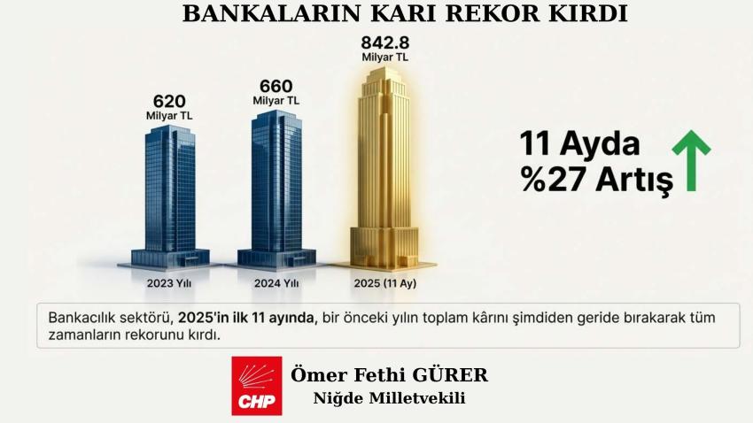 BANKALARIN KÂRI 11 AYDA 842 MİLYAR TL! CHP Milletvekili Ömer Fethi Gürer, “Verilere göre bankacılık sektörü, 2023 yılını 620 milyar TL, 2024 yılını ise 660 milyar TL net kârla kapatmıştı. Ancak 2025 yılının henüz ilk 11 ayında bu rakam 842 milyar 845 milyon TL’ye ulaşarak tüm zamanların aştı. Bankalar, vatandaşın borç yükü altında ezildiği bir dönemde kârlarını bir önceki yılın tamamına göre şimdiden 27 oranında artırmayı başardı,” dedi.