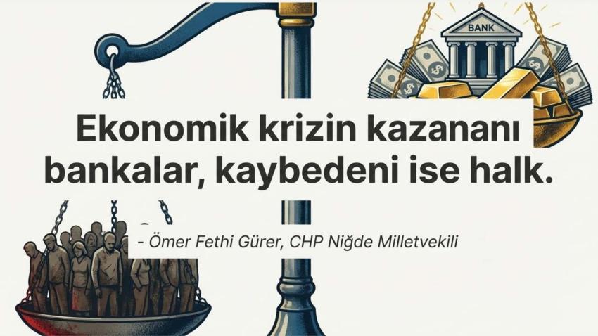 CHP Niğde Milletvekili Ömer Fethi Gürer, bankacılık sektörünün 2025 yılı verilerini değerlendirdi. Gürer, “Bankalar 11 ayda 843 milyar TL kâr ederken, vatandaşın takipteki borcu bir yılda tam iki katına çıktı. Halkın bankalara ödediği faiz ise 1 trilyon TL barajını aştı. Sadece Kasım ayında bankaların kasasına giren net kazanç miktarı 91 milyar TL'yi buldu. Bankalar 2025 yılının ilk 11 ayında 843 milyar TL net kâr elde etti. Vatandaş artan geçim sıkıntısı ile mücadele edip yüksek faiz ve enflasyonla boğuşurken, bankalar günde ortalama 2,5 milyar TL kâr etti,” dedi. Türkiye’de milyonlarca emekli, asgari ücretli, dar ve sabit gelirli geçim derdiyle mücadele ederken, bankaların ise kârlarını katladı. CHP Niğde Milletvekili Ömer Fethi Gürer, "ekonomik krizin kazananı bankalar” dedi.