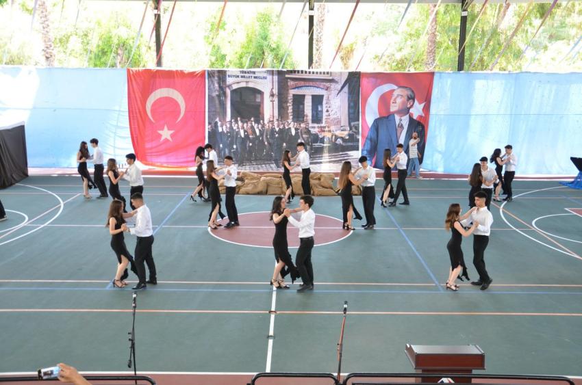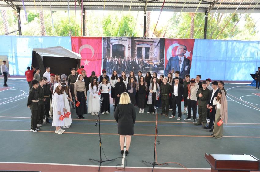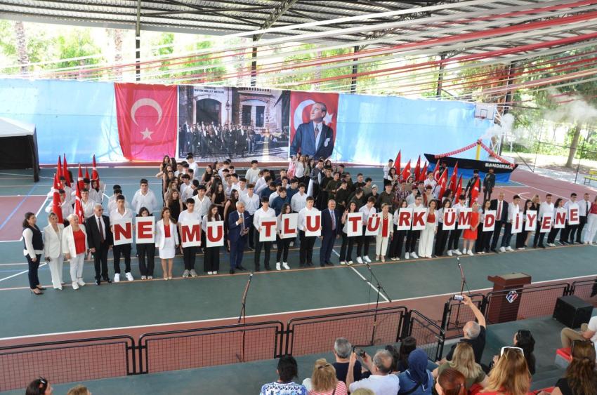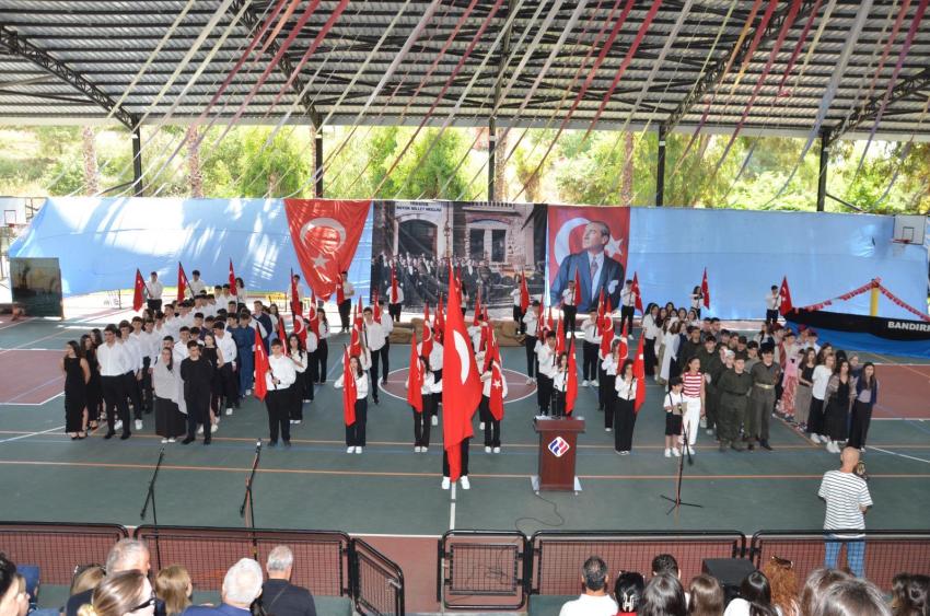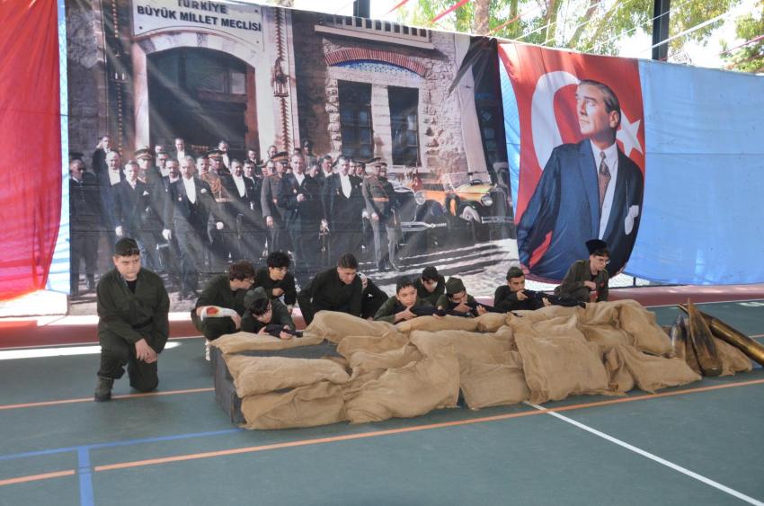 Dumanı tüten Bandırma Vapuru eşliğinde “Mustafa Kemal’den Mektup Var “ tiyatro gösterisini sahneleyen öğrencilerin performansları göz doldurdu. Özellikle Hasan Tahsin’in ilk kurşununu sahneleyen gençler izleyenleri duygulandırdı. İzmir Marşı’nın seslendirilmesinin ardından öğrencilerin İstiklal Marşı’nın 10 kıtasını büyük bir coşkuyla okuması büyük bir gururdu. Zeybek, Vals Dansı sonrası gençlerin sahaya “Ne Mutlu Türküm Diyene” yazılı pankartlarla çıkması tam bir görsel şölen oluşturdu.
