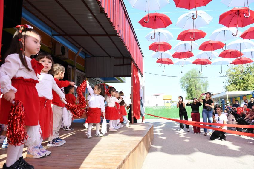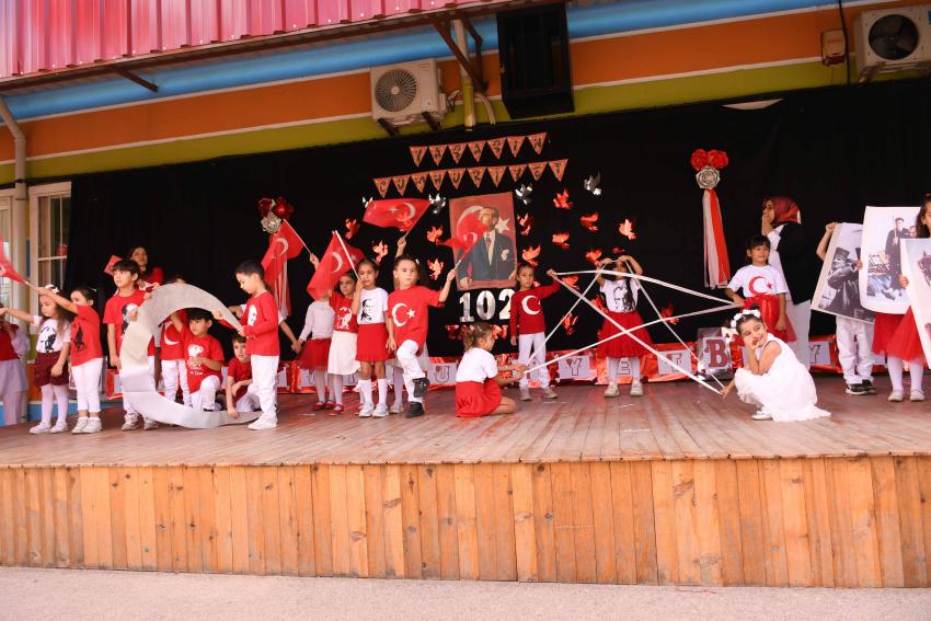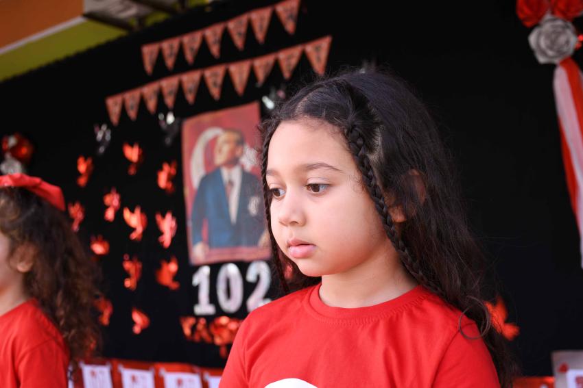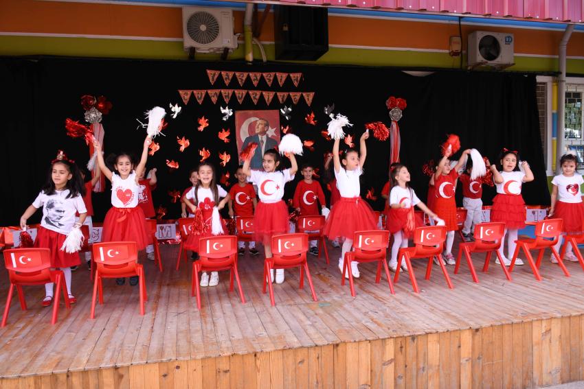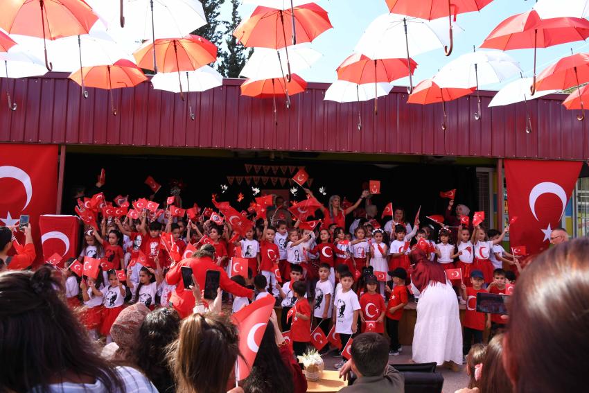 Etkinlik boyunca kırmızı-beyaz renkli şemsiyelerle süslenen okul bahçesi, Cumhuriyet coşkusuna görsel bir şölen kattı. Miniklerin Cumhuriyet’e olan sevgisi ve bağlılığı, izleyicilerden tam not aldı.