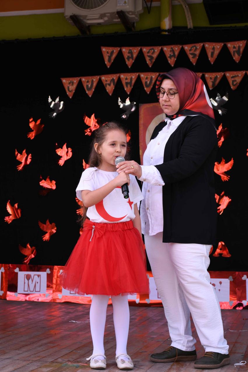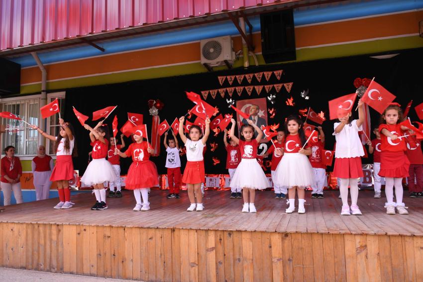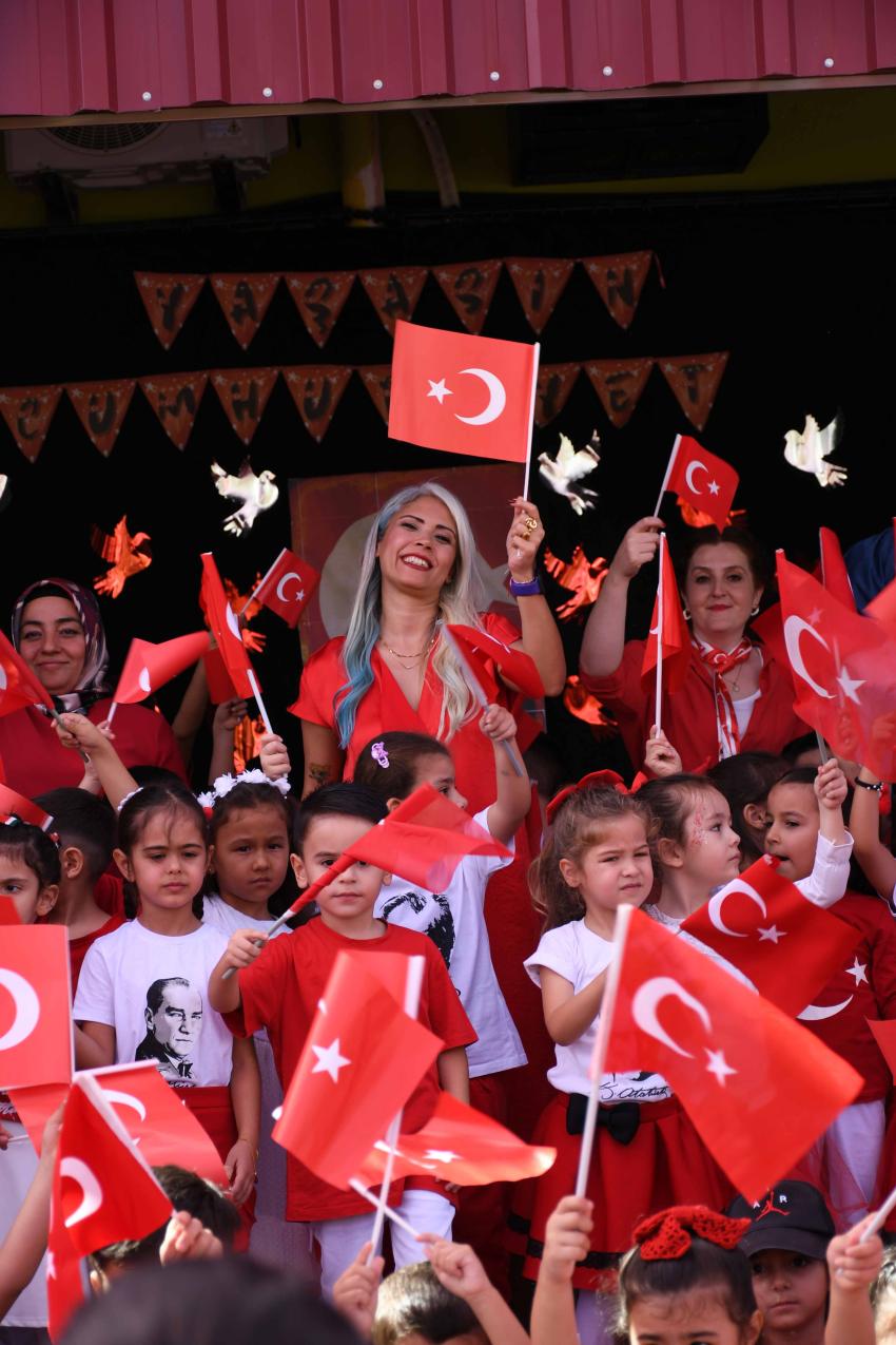 Türk bayraklarıyla süslenen sahnede rengarenk kostümleriyle yer alan çocuklar, Atatürk ve Cumhuriyet temalı performanslarıyla izleyenleri hem gururlandırdı hem de duygulandırdı.