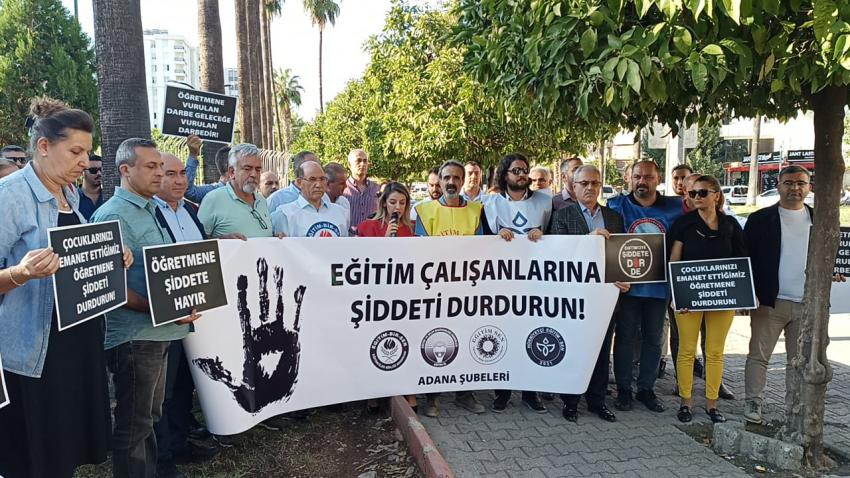 Adana’da 4 eğitim sendikası, öğretmenlere yönelik şiddeti kınayarak, “Çocuklarımızı emanet ettiğimiz öğretmene şiddeti durdurun!” diyerek şiddet faillerine caydırıcılık için en ağır cezaların verilmesini istedi. Eğitim-Bir-Sen Adana Şube Başkanı Mehmet Sezer, Eğitim-İş Adana 1 Nolu Şube Başkanı Seher Ergin, Eğitim-İş Adana 2 Nolu Şube Başkanı Mutlu Gül, Eğitim-Sen Adana Şube Başkanı Hüseyin Kaya ve Hürriyetçi Eğitim Sen Adana Şube Başkanı Ergun Ayyıldız birlikte öğretmenlere yapılan şiddete karşı basın açıklaması yaptı. Basın açıklamasını okuyan Eğitim-İş Adana 1 Nolu Şube Başkanı Seher Ergin, “Öğretmeni itibarsızlaştıran; toplumdaki yerini ve okuldaki işlevini her fırsatta küçültmeye neden olan uygulamalar, öğretmene şiddet vakalarının temelidir. Bugüne dek öğretmene şiddet olaylarının faillerinin caydırıcı cezalar almaması da dolaylı teşvik niteliğindedir” dedi. 4 eğitim sendikasının ortaklaşa basın açıklamasında şunlar belirtildi: “Neredeyse her geçen gün yurdun bir köşesinde öğretmene şiddet vakası baş gösterirken, MEB hala bu konuya dair engelleyici ve/veya koruyucu herhangi bir önlem politikası geliştirememiştir. En ücra köşelere tayin edildiğinde bile "Vatan toprağıdır" diyerek özveriyle görevini yapan, hali hazırda yoksulluk ve işsizlikle her an burun buruna getirilen eğitim neferlerimiz, toplumda baş tacı edilmesi gerekirken itibarsızlaştırma politikaları sayesinde her türlü saldırıya açık hale gelmiştir. Herkesin saygı duyduğu, öğretmenin toplumun öncüsü konumundaki zamanlardan öğretmenine sahip çıkmayan, saygı duymayan, öğretmenini söylemleri ve eylemleri ile saydırmayan, veli ve öğrencilerin fiziki-psikolojik saldırılarına maruz bırakan bir eğitim sisteminin hâkim kılındığı zamanlara geldik. Eğitim çalışanlarının baskı ve tehditlerin kıskacına bırakıldığı, güvensiz ve güvencesiz iş ortamlarına itildiği, eğitim-öğretim ve bilim hizmetleri iş kolundaki görevlerin piyasacı bir anlayışla yürütüldüğü, öğrenci-öğretmen-veli ilişkisinin giderek yozlaştığı bir ortamda eğitim ve öğretim mekanizmasının toplumu dönüştüren ve iyileştiren bir sonuç üretmesi beklenemez. Milli Eğitim Bakanlığı’na çağrımızdır: